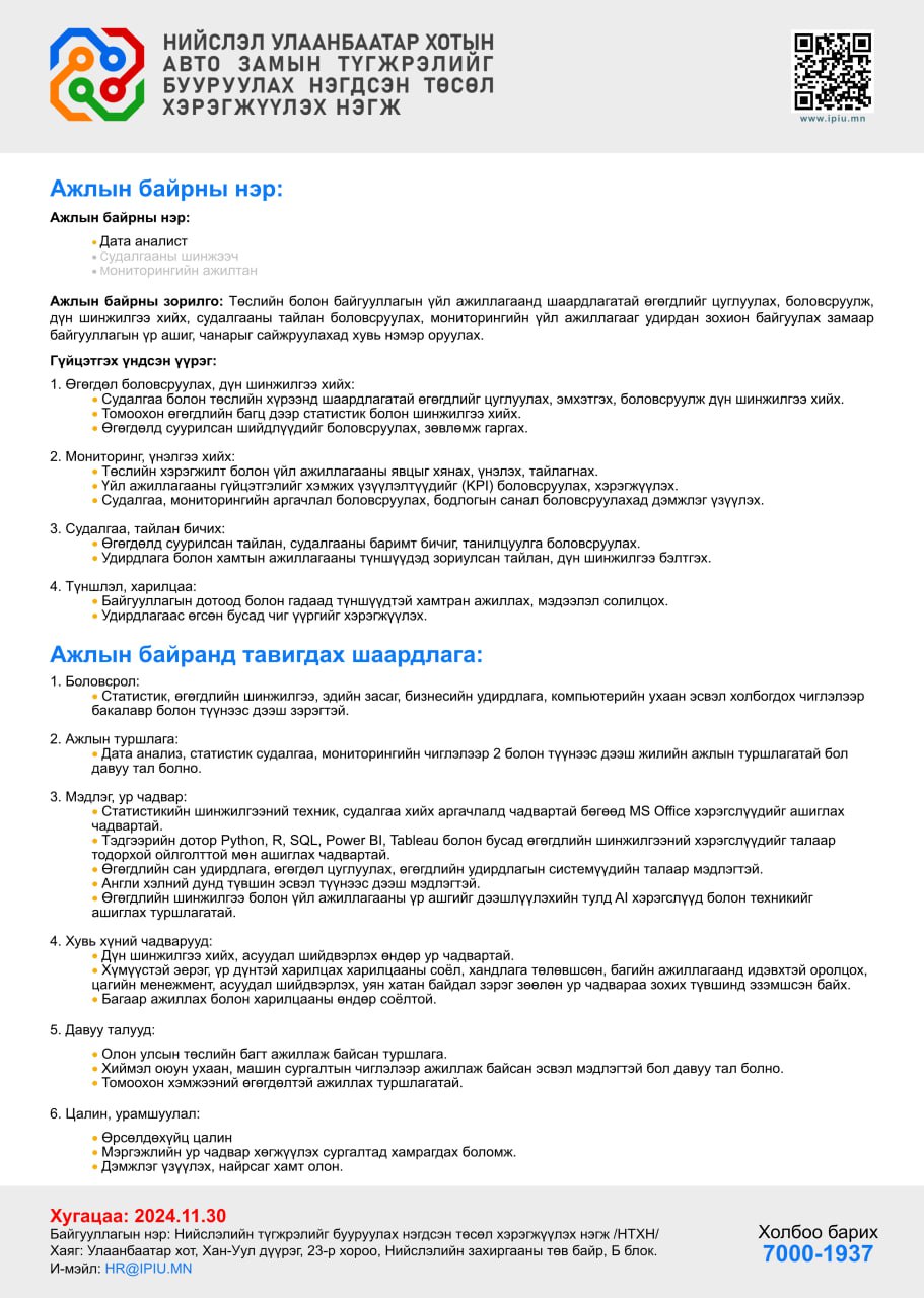 "Та нээлттэй ажлын байранд тавигдах шаардлагыг хангаж байна гэж үзвэл төрийн албан хаагчийн анкетыг бөглөн [email protected] хаягаар илгээнэ үү. холбоо барих ☎️ 70001937"