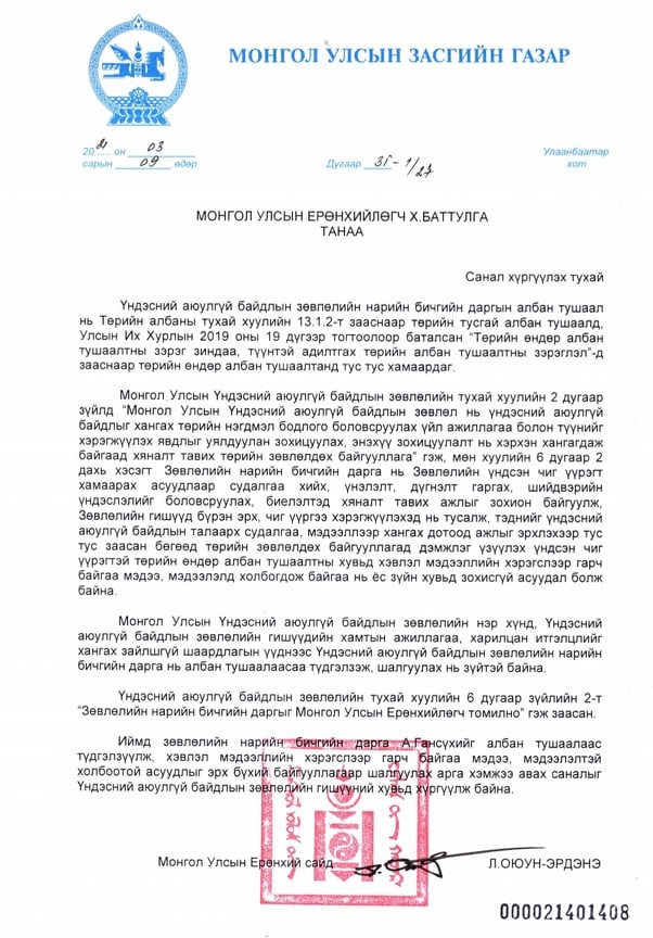 “Төрийн зөвлөлдөх байгууллагад дэмжлэг үзүүлэх үндсэн чиг үүрэгтэй төрийн өндөр албан тушаалтны хувьд хэвлэл мэдээллээр гарч байгаа мэдээ, мэдээлэлд холбогдож байгаа нь ёс зүйн хувьд зохисгүй асуудал болж байна. Монгол Улсын Үндэсний аюулгүй байдлын зөвлөлийн нэр хүнд, Үндэсний аюулгүй байдлын зөвлөлийн гишүүдийн хамтын ажиллагаа, харилцан итгэлцлийг хангах зайлшгүй шаардлагын үүднээс Үндэсний аюулгүй байдлын зөвлөлийн нарийн бичгийн дарга нь албан тушаалаасаа түдгэлзэж, шалгуулах нь зүйтэй байна” гэжээ.