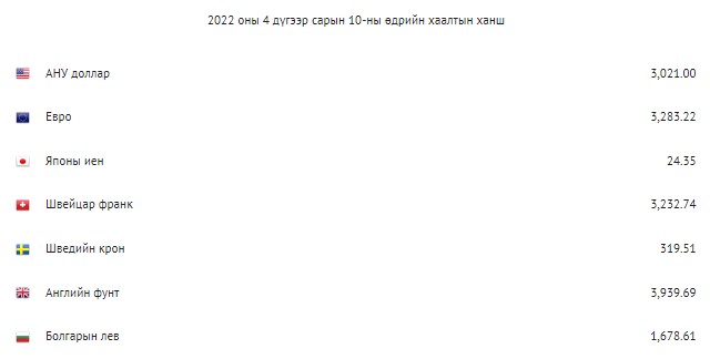 Монголбанкны дөрөвдүгээр сарын 10-ны өдрийн хаалтын ханшаар төгрөгтэй харьцах ам.долларын үнэ 3021 төгрөгт хүрчээ. Харин евро 3239.69, фунт 3939.69, рубль 38.22, юань 474.79 төгрөгт хүрсэн байна.
