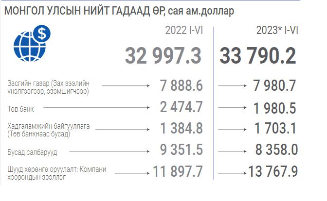 Монголбанкнаас гаргасан мэдээллээр 2022 оны эцсийн байдлаар Монгол Улс Засгийн газрын 7.6 тэрбум тэргүүтэй нийт 32.4 тэрбум ам.долларын гадаад өртэйг зарлаад байв. Тэгвэл Үндэсний статистикийн хорооноос гаргасан шинэ мэдээллээр 2023 оны наймдугаар сарын байдлаар улсын гадаад өр 33.7 тэрбум ам.доллар болж өсжээ.