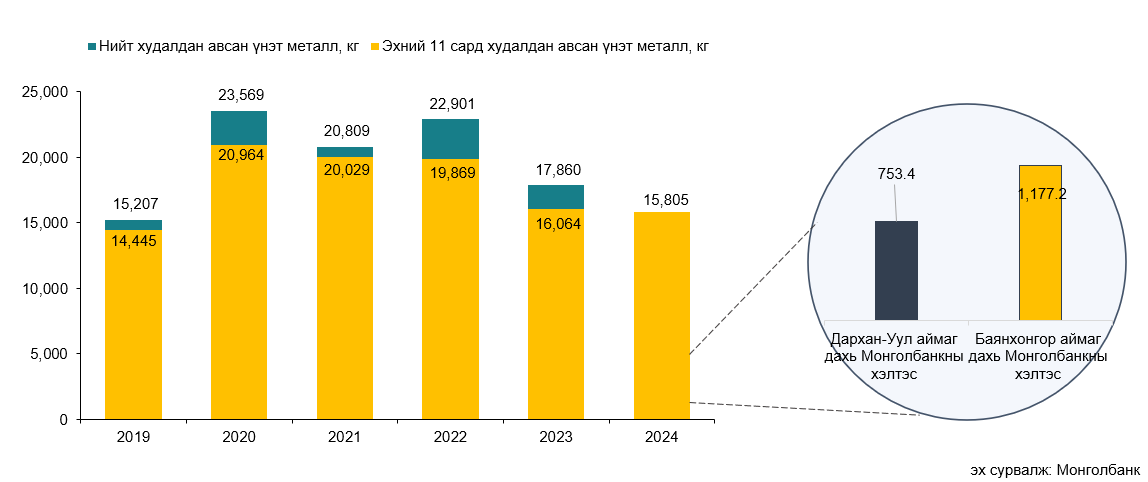 Харин ийм байдлыг бий болгохгүй үүднээс Монголбанк 2018 оны тавдугаар сараас “Эх орныхоо алтыг эрдэнэсийн сандаа” аян өрнүүлж эхэлсэн. Алтаа Монголбанканд худалдсанаар улс орныхоо эдийн засагт ихээхэн хувь нэмэр оруулж байгааг нь алт олбоглогчдод ойлгуулах зорилготой. Энэ нь ч сайн үр дүн үзүүлж, өмнө нь Төв банканд алт олборлогчид жилд дунджаар 2-3 тонн алт тушаадаг байсан бол аян өрнүүлж эхэлсэн 2018 онд 22 тонн болж, бүх цагийн үеийн хамгийн өндөр түвшиндээ хүрсэн. Гэсэн ч түүний дараа жил нь буюу 2019 онд үнэт метал худалдан авах хуульд өөрчлөлт орноос хойш жилийн дотор Монголбанкны алт худалдан авалт 15.2 тонн болтлоо буурсан бөгөөд түүнээс хойш 2018 онд үзүүлсэн 22 тонн алт худалдан авсан амжилтаа даваагүй байгаа буюу жилээс жилд алт худалдан авах нь багасаж, гадаад валютын нөөцөө нэмэгдүүлэх, монгол төгрөгийн гаднын валютуудтай харьцах ханшийн чангаруулахад нөлөө үзүүлж чадахгүй болж ирсэн аж.
