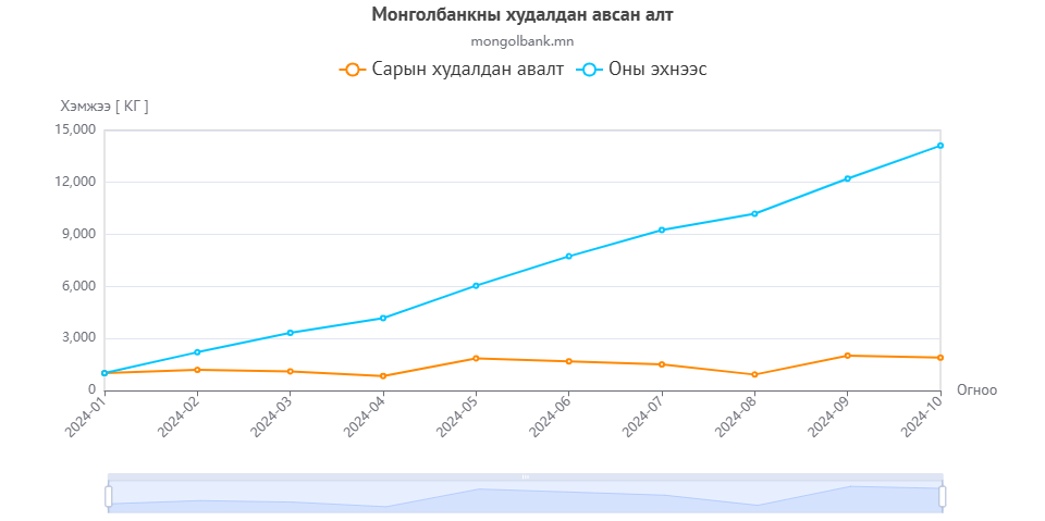 Монголбанкнаас шинэ гаргасан тайландаа өнгөрсөн арваннэгдүгээр сард 1.6 тонн үнэт метал худалдан авснаа мэдээллээ. Ингэснээр оны эхнээс өссөн дүнгээр Төв банк 2024 онд нийт 15.8 тонн үнэт метал худалдан аваад байгаа юм. Гэсэн ч оны эхнээс 0.8-2 хүртэлх тонноор худалдан авч байсан Төв банкны алтны нөөц оны сүүлчид дахин сөрөг дүнтэй гарч байна. Тухайлбал, өнгөрсөн есдүгээр сард Монголбанк хоёр тонн алт худалдан авсан ч нийт алт худалдан авалтын хэмжээ 7.9 хувиар буурсан үзүүлэлттэй гарсан. Харин энэ удаад арваннэгдүгээр сард 1.6 тонн алт худалдан авч, энэ онд нийт 15.8 тонн алт худалдан авсан ч өнгөрсөн оны мөн үеэс 1.6 хувиар буураад байгаа аж. Түүнчлэн оны эхнээс өссөн дүнгээр Төв банкнаас гадна: