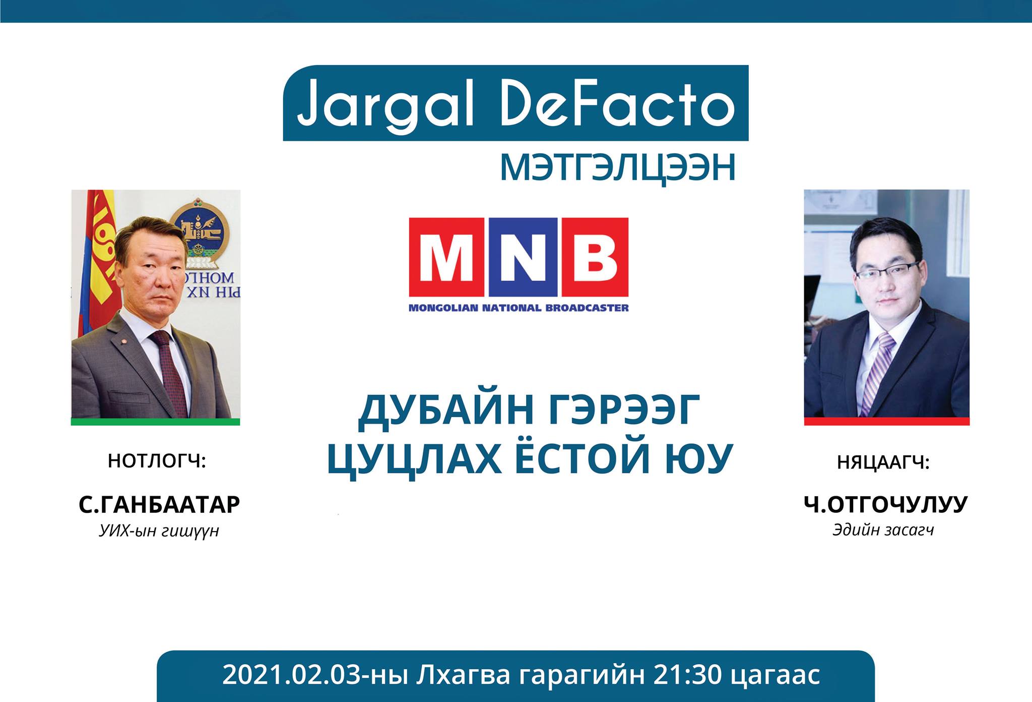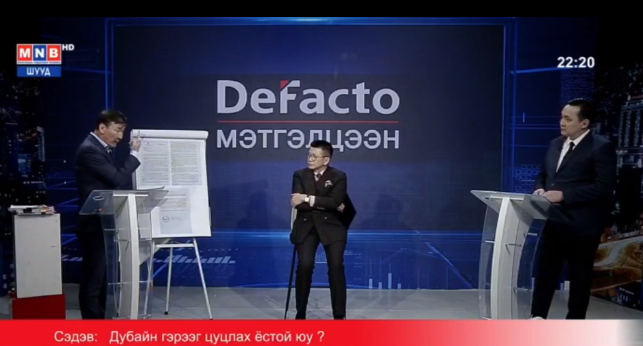УИХ-ын гишүүн С.Ганбаатар, эдийн засагч Ч.Отгочулуу нар өчигдөр МҮОНРТ-ээр “Дубайн гэрээг цуцлах нь зөв үү” гэсэн сэдвээр мэтгэлцсэн билээ. УИХ-ын гишүүн С.Ганбаатар Ч.Сайханбилэгийн Засгийн газрын үед байгуулагдсан “Дубайн гэрээ” хэмээн нэрлэгддэг Оюутолгойн далд уурхайн бүтээн байгуулалтын төлөвлөгөөг цуцлах ёстой гэсэн байр сууриа хамгаалсан бол эдийн засагч Ч.Отгочулуу “Хэн нэгэн улстөрчийг хамгаалах гэж ирээгүй. Оюутолгойн ТУЗ-д ажиллаж байсан эдийн засагч хүнийхээ хувьд няцаалт өгнө” гэсэн юм. Тэрбээр “Дубайн гэрээг цуцлах нь буруу” хэмээн үзэж байгаагаа тайлбарлаад, Монгол Улсын эдийн засаг Оюутолгойн нуруун дээр явж байгаа талаар дурдсан.
