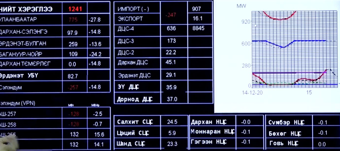 Хамгийн чухал нь өвлийн их ачаалал эхлээгүй байгаа бөгөөд цахилгааны хэрэглээ багасахад бидэнд дахиад гурван сарын хугацаа байгаа юм. Нэг сар бүүхэл хоёр хоногт эрчим хүчний системийн үйлдвэрлэж чадах дээд хэмжээнд хэрэглээ дөхөж очно гэдэг уг салбар ослын горимд ажиллаж эхэлснийг илтгэж байгааг албаныхан анхааруулж эхэллээ. Энэ тухайд Диспетчерийн үндэсний төв ТӨХХК-ийн гүйцэтгэх захирал Г.Балжинням “Монгол Улсын нийт газар нутгийн 70-80 хувийг эрчим хүчээр хангадаг Төвийн бүсийн эрчим хүчний системийн ачаалал өнөөдрийн (2020.12.14) 18:00 цагийн байдлаар 1224 МВт хүрсэн нь ачаалал эрс нэмэгдэж, ослын нөхцөлд ажиллаж буй үзүүлэлт. Үүний 777 МВт-ыг Улаанбаатар хот хэрэглэж байгаа нь хяналтын самбарт улаан өнгөөр харагдаж байна. Манай улс ОХУ-аас 233 МВт эрчим хүч авахад хүрлээ. Төвийн бүсийн эрчим хүчний систем цахилгааны огцом өссөн хэрэглээнээс болж, ослын нөхцөлд ажиллаж байна. Хэрэв техникийн хүчин чадлаас давсан тохиолдолд цахилгаан станцын автомат системүүд ажиллаж, тоног төхөөрөмжөө хамгаалахын тулд хэрэглэгчдийн цахилгааныг таслахаас аргагүйд хүрнэ” гэсэн юм.