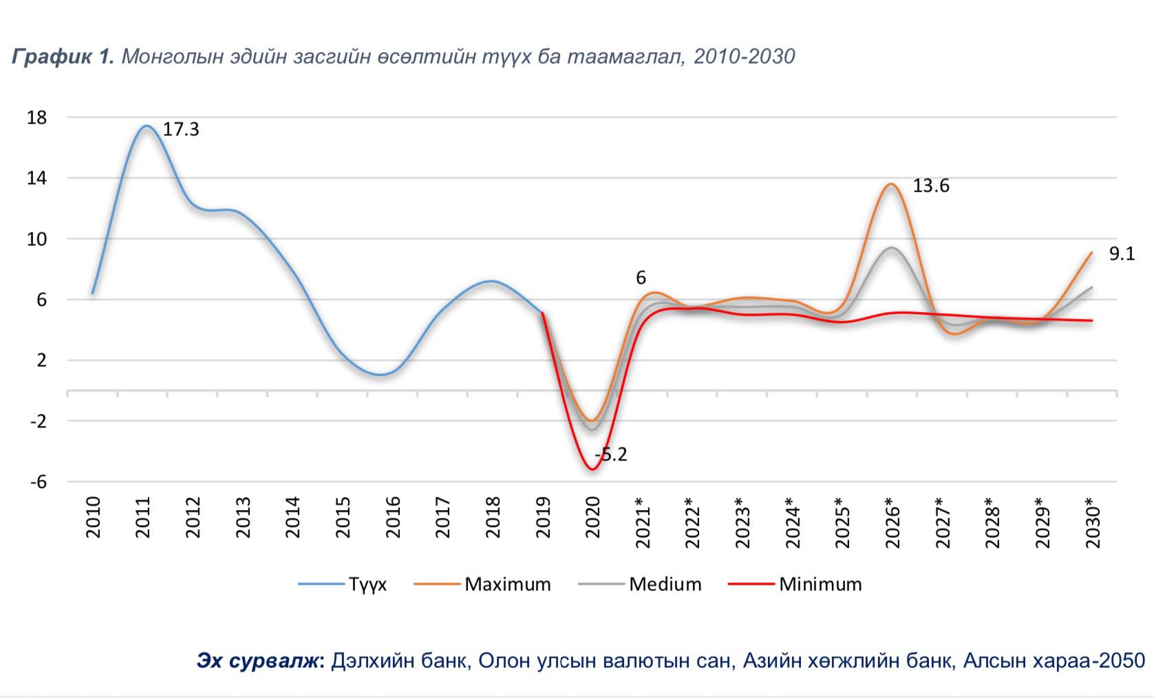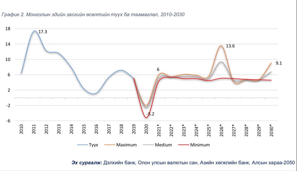 Мэргэжлийн байгууллагууд МУ-ын эдийн засаг 2020 онд -5.2%-аар агшиж, 2021 онд 4.5%-6.4% болж сэргэн, цаашид тогтвортой өсөх ба Мега төслүүдийн нөлөөллөөр 2026 онд 13.6% хүртэл өсөлт үзүүлэх боломжтой гэж дүгнэж байна.