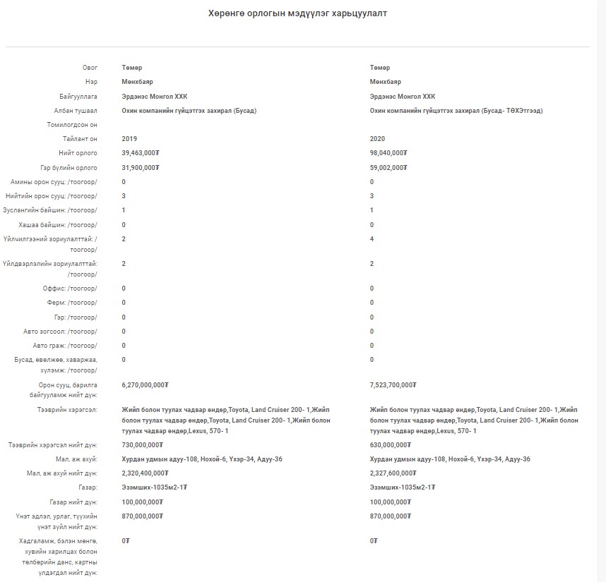 “Эрдэнэс Силвер Ресурс” ХХК-ийн гүйцэтгэх захирал Т.Мөнхбаяр 2020 онд АТГ-т мэдүүлсэн хөрөнгө, орлогын мэдүүлэгтээ нийт 98 сая төгрөгийн орлоготой гэж мэдүүлжээ.