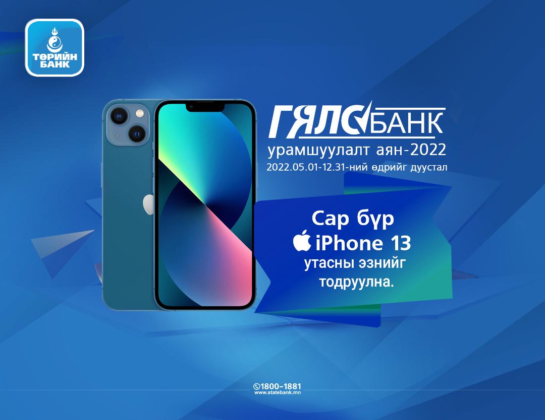 Та Гялсбанк үйлчилгээг ашиглан гүйлгээ хийх, зээл авах, хэрэглээний төлбөр, торгууль, татвар төлөх зэргээр сард зургаагаас гүйлгээ хийснээр урамшуулалт аянд хамрагдаж, iPhone13 гар утасны эзэн болох боломжтой аж.