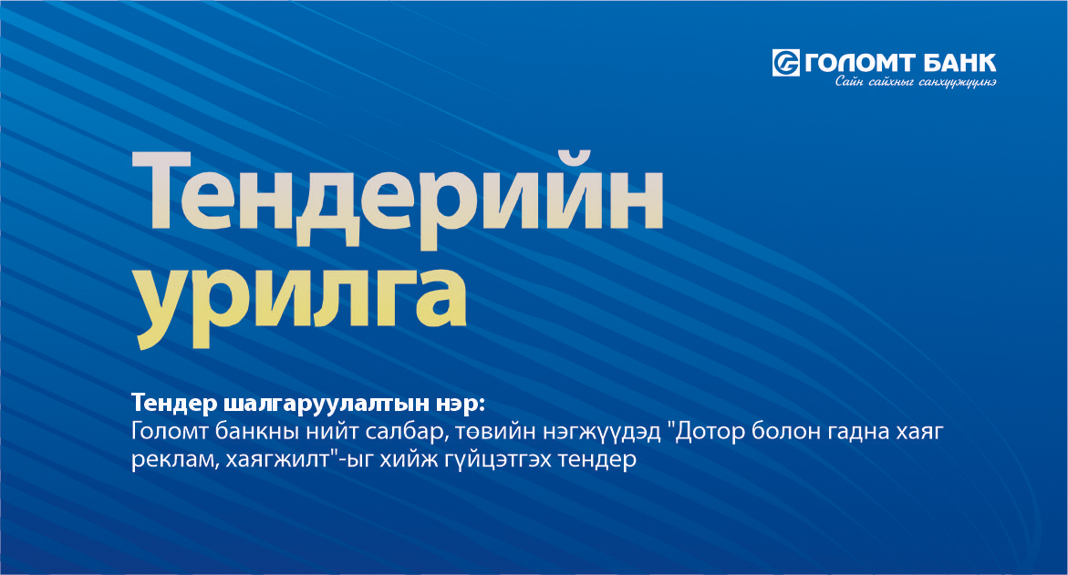 Эрх бүхий компаниудыг Голомт банкны нийт салбар, төвийн нэгжүүдэд “ДОТОР БОЛОН ГАДНА ХАЯГ, ХАЯГЖИЛТ, РЕКЛАМ ЧИМЭГЛЭЛ”-ийг хийж, гүйцэтгэх тендерийн нээлттэй сонгон шалгаруулалтад урьж байна.
