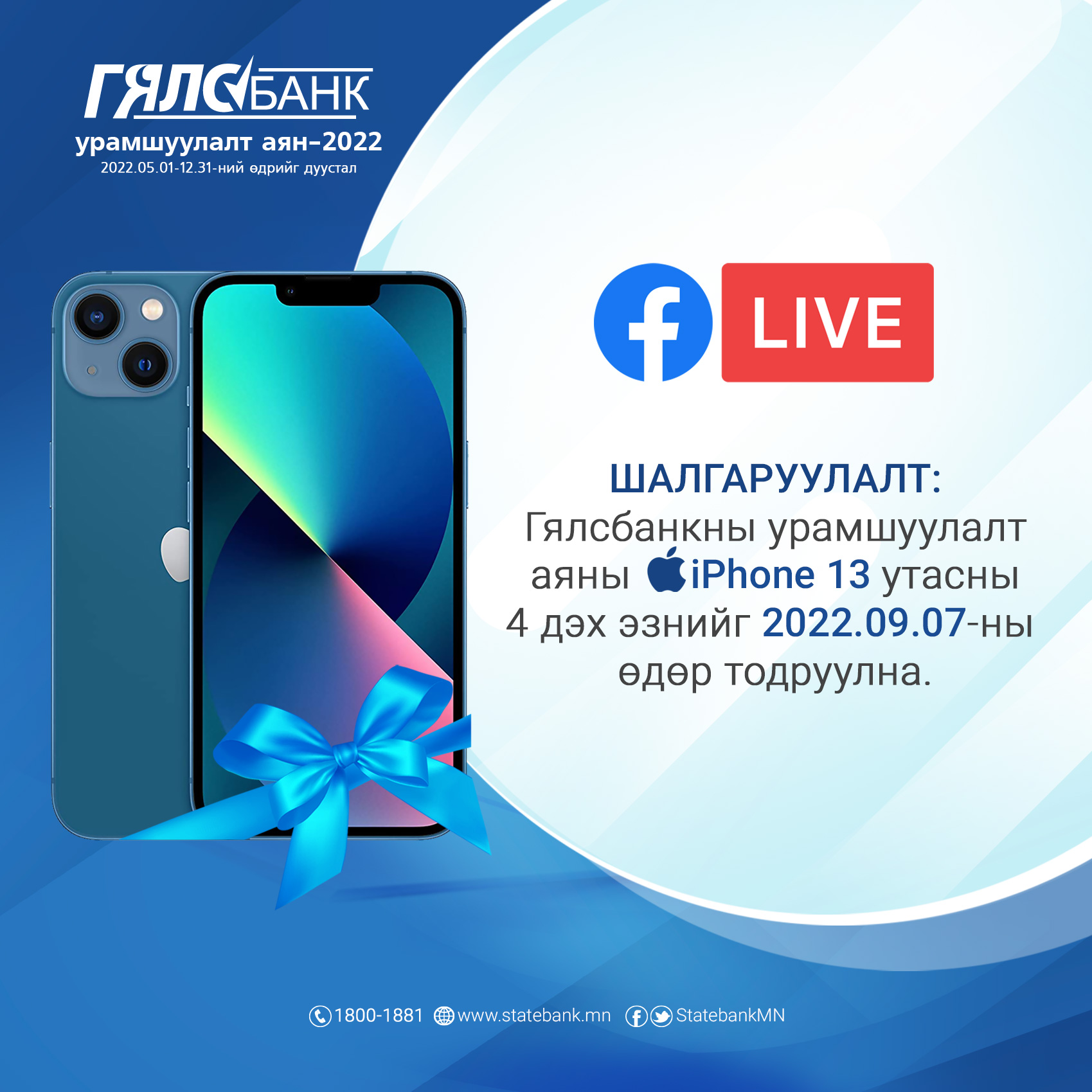 Цахим эринд амьдарч буй өнөө цагт Төрийн банк нь Гялсбанк үйлчилгээгээ харилцагчдынхаа хэрэгцээнд бүрэн нийцүүлэн, улам хөгжүүлэн ажилласаар байна. Та замын түгжээнд цаг алдалгүй, банканд очиж дараалал хүлээхгүйгээр алтан цагаа хэмнэхийн зэрэгцээ Гялсбанкны урамшуулалт аяндаа оролцон iPhone13 утасны эзэн болоорой.