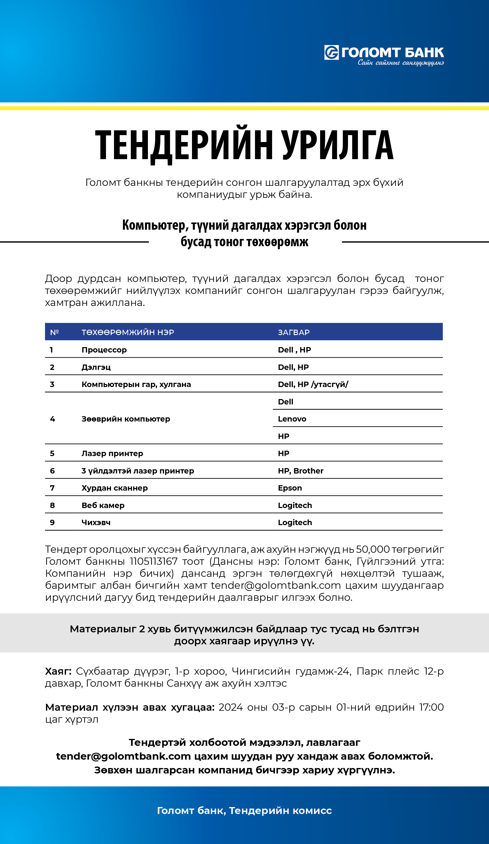 Голомт банкнаас тендерийн урилга хүргүүлж байна.