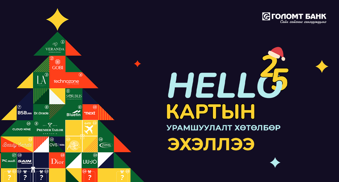 Хуучин оноо үдэж, шинэ оноо угтах гэж буй сэтгэл догдлом энэ өдрүүдэд баярын ширээгээ засах, хайртай дотны хүмүүстээ бэлэг бэлдэх гээд шинэ жилийн худалдан авалт хийх хэрэгцээ тулгарч байна уу? Тэгвэл Голомт банк бүх төрлийн кредит картын харилцагчдадаа зориулан 2024.12.05 – 2024.12.31-ний өдрийг дуустал “Hello 2025” урамшуулалт хөтөлбөрийг зарлаж байна.