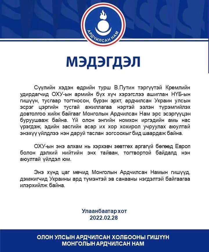 Тус мэдэгдэлд "Сүүлийн хэдэн өдрийн турш В.Путин тэргүүтэй Кремлийн удирдагчид ОХУ-ын армийн бүх хүч хэрэгслээ ашиглан НҮБ-ын гишүүн, тусгаар тогтносон, бүрэн эрхт, ардчилсан Украин улсын эсрэг цэргийн тусгай ажиллагаа нэртэй эзлэн түрэмгийлэх довтолгоо хийж байгааг Монголын Ардчилсан Нам эрс эсэргүүцэн буруушааж байна. Үй олон энгийн номхон иргэдийн амь нас үрэгдэж, эдийн засгийн асар их хор хохирол учруулах аюултай энэхүү үйлдлээ нэн даруй таслан зогсоохыг бид шаардаж байна.