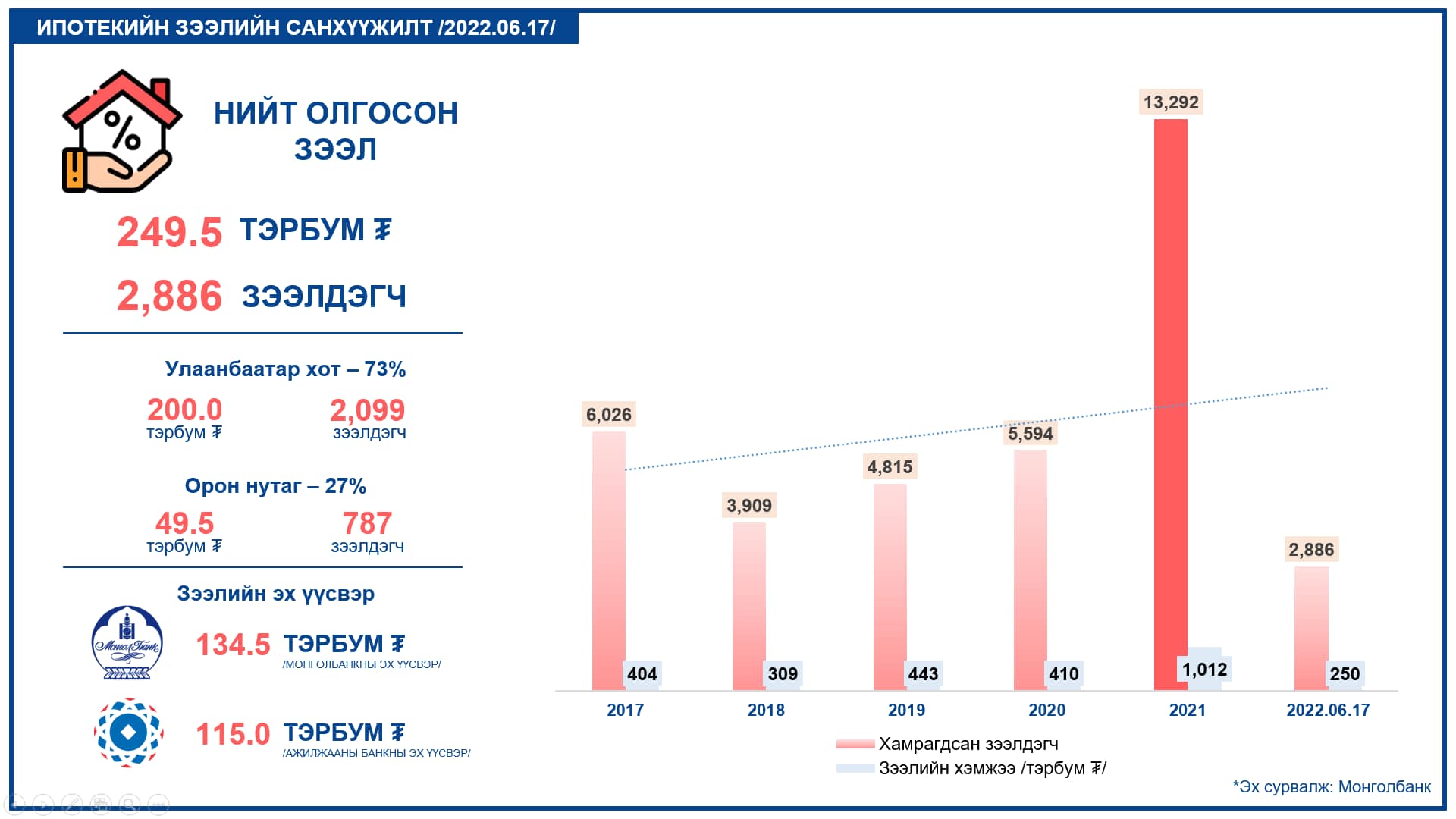 Монголбанкнаас өнөөдөр буюу 2022 оны зургадугаар сарын 17-ны байдлаар нийт олгосон ипотекийн зээлийн талаар мэдээллээ. Энэ хугацаанд Монголбанк болон бусад арилжааны банкны эх үүсвэртэй 249.5 тэрбум төгрөгийн санхүүжилтийг 2886 зээлдэгчид олгосон байна.