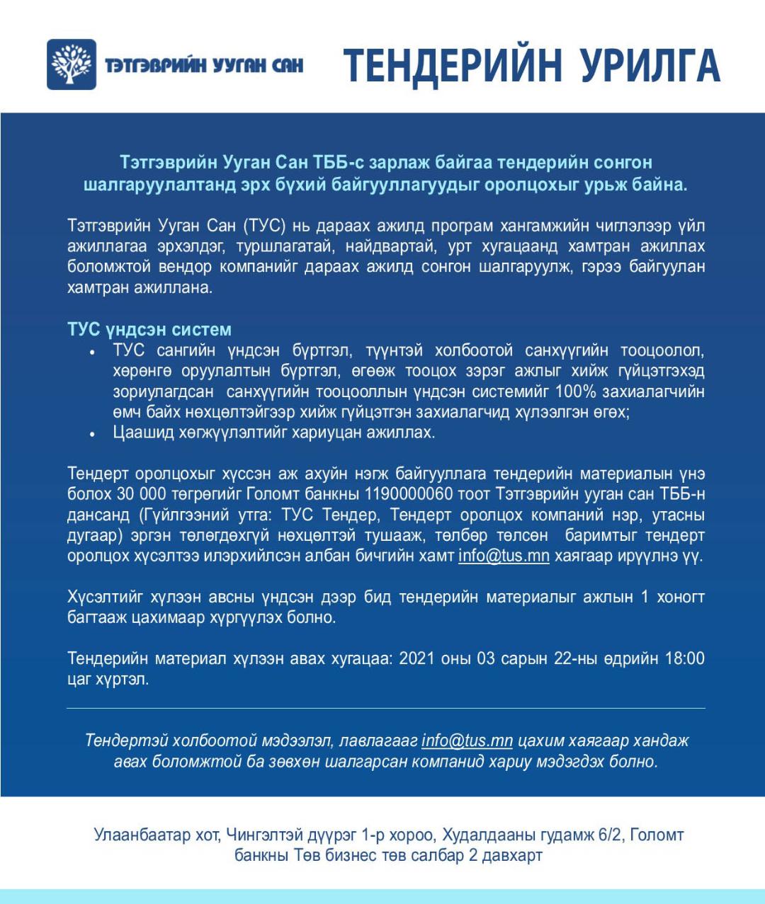 | "Тэтгэврийн Ууган Сан" ТББ: Програм хангамжийн чиглэлээр ажилладаг компаниудыг сонгон шалгаруулалтад урьж байна |