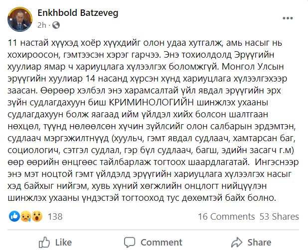 Өөрөөр хэлбэл, энэ харамсалтай үйл явдал эрүүгийн эрх зүйн судлагдахуун биш, Криминологийн шинжлэх ухааны судлагдахуун болж яагаад ийм үйлдэл хийх болсон шалтгаан нөхцөл, түүнд нөлөөлсөн хүчин зүйлсийг олон салбарын эрдэмтэн, судлаач мэргэжилтнүүд (хуульч, гэмт явдал судлаач, хамтарсан баг, социологич, сэтгэл судлал, гэр бүл судлаач, багш, эдийн засагч г.м) өөр өөрийн өнцгөөс тайлбарлаж тогтоох шаардлагатай. Ингэснээр энэ мэт ноцтой гэмт үйлдэлд эрүүгийн хариуцлага хүлээлгэх насыг хэд байхыг нийгэм, хувь хүний хөгжлийн онцлогт нийцүүлэн шинжлэх ухааны үндэстэй тогтоох боломжтой” хэмээсэн байна.