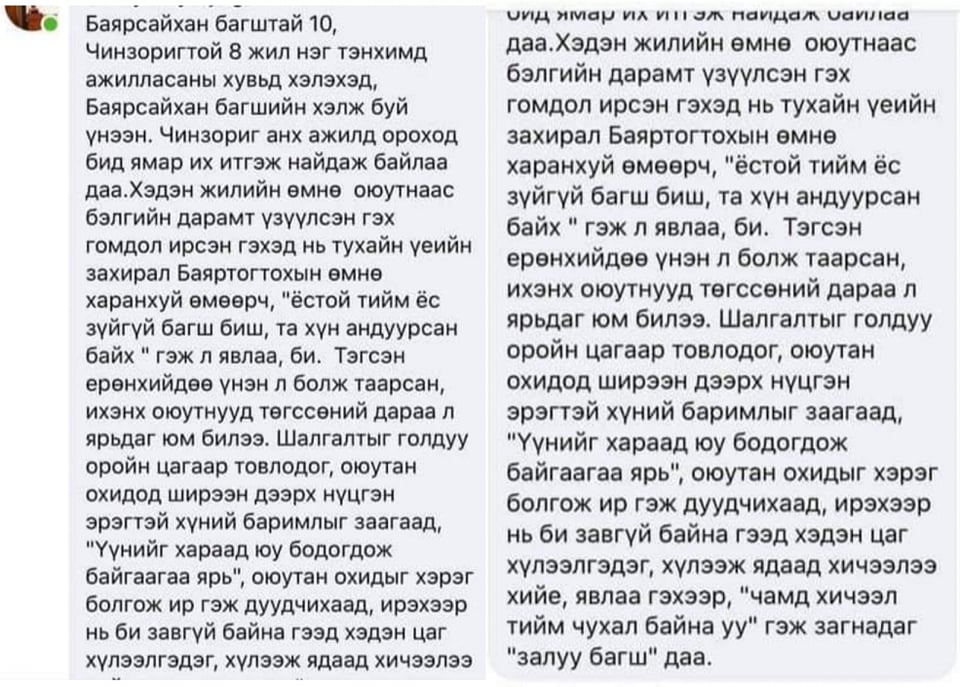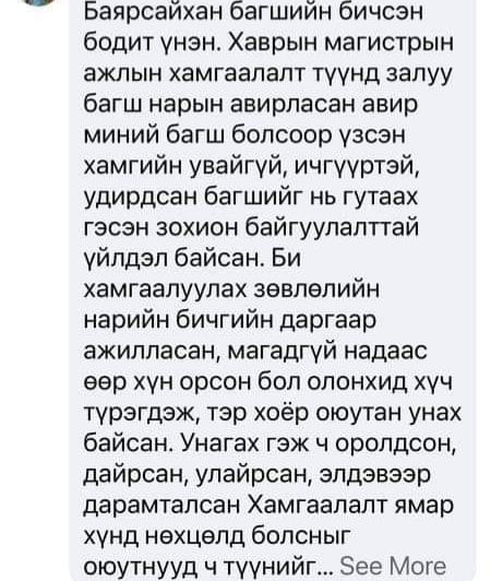 ЖИШЭЭ-3: Д.Баярсайхан багшийн бичсэн зүйл үнэн. Өнгөрсөн хаврын магистрын ажлын хамгаалалтын үеэр залуу багш нарын гаргасан авир бол миний багш болсноосоо хойш үзсэн хамгийн муухай увиагүй, ичгүүртэй, удирдсан багшийг нь гутаах гэсэн зохион байгуулалттай үйлдэл байсан. Би Хамгаалуулах зөвлөлийн нарийн бичгийн даргаар ажилласан. Магад надаас өөр хүн орсон бол олонход хүч түрэгдэж, тэр хоёр оюутан шалгалтандаа унах байсан. Унагах гэж ч оролдсон, дайрсан, улайрсан, элдвээр дарамталсан хамгаалалт ямар хүнд нөхцөлд болсныг оюутнууд ч мэдэж байгаа. Эрх биш бичлэг, сонссон гэрчүүд байхад мэлзэж чадахгүй байлгүй дээ. Хамгаалсан оюутны дипломын ажлыг сүүлд нь ч хүлээж авахгүй, гарын үсэг зурж өгөхгүй боож, хааж байсан. Д.Баярсайхан багш багшийн сэтгэлээр оюутнуудаа өмөөрч “Увиагүй, ичгүүргүй, хүчирхийлэгчтэй хамт ажиллахгүй” гэдгээ илэрхийлсэн нь зөв.