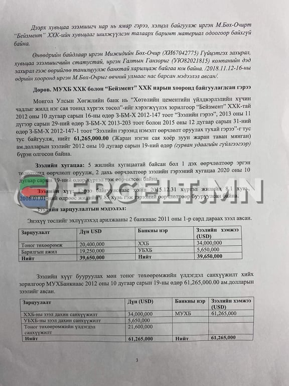 Тэгвэл “Бейзмент” компани Төрийн өмчит “Хөтөлийн цемент шохой”-н үйлдвэрт Хөрөнгө оруулалт хийх асуудал анх Сү.Батболдын Засгийн газрын үед яригдсан байдаг. УИХ-ын 2010 оны “Төрийн өмчийг 2010-2012 онд хувьчлах, өөрчлөн байгуулах үндсэн чиглэл батлах тухай” 11 дүгээр тогтоолд “Хөтөлийн цемент шохой” ХК-ийн цемент үйлдвэрлэх технологийг хуурай аргад шилжүүлэх нөхцөлтэйгөөр гадаад, дотоодын хөрөнгө оруулалтыг татах тухай заалт тусгагдсан. Уг заалтыг хэрэгжүүлэх зорилгоор гадаад, дотоодын 10 байгууллагаас ирүүлсэн саналаас “Бейзмент” ХХК-ийг шалгаруулж, 10 жилийн хугацаатай гэрээ байгуулжээ. Гэрээний дагуу үйлдвэрлэлийн хүчин чадлыг өргөтгөх, цементийг хуурай аргаар үйлдвэрлэх төслийг эхлүүлсэн байдаг. Төслийг хэрэгжүүлэхийн тулд Хөгжлийн банкнаас 2012 онд 62 сая ам.долларын барьцаагүй зээл авч, бүтээн байгуулалтын ажлыг 2014 оны тавдугаар сарын 14-ний өдөр дуусгаж, цемент үйлдвэрлэх хүчин чадлыг жилд нэг сая тонн болгон нэмсэн байдаг. Ингээд өргөтгөсөн хүчин чадлаараа ажиллах болтол олигтой үр дүнд хүрээгүй. Өөрөөр хэлбэл, төрийн өмчит компанийнхантай “Бейзмент” ХХК-ийнхан хамтарч ажиллаад ч үр дүнд хүрээгүй юм. Ингээд Хөгжлийн банкнаас авсан зээлээ цаг тухай бүрд нь төлж чадахгүй явсаар өнөөдөртэй золгоод байгаа юм. Одоогоор уг гэрээний хүрээнд 86 сая гаруй ам.долларын өртэй болоод байгаа ажээ.