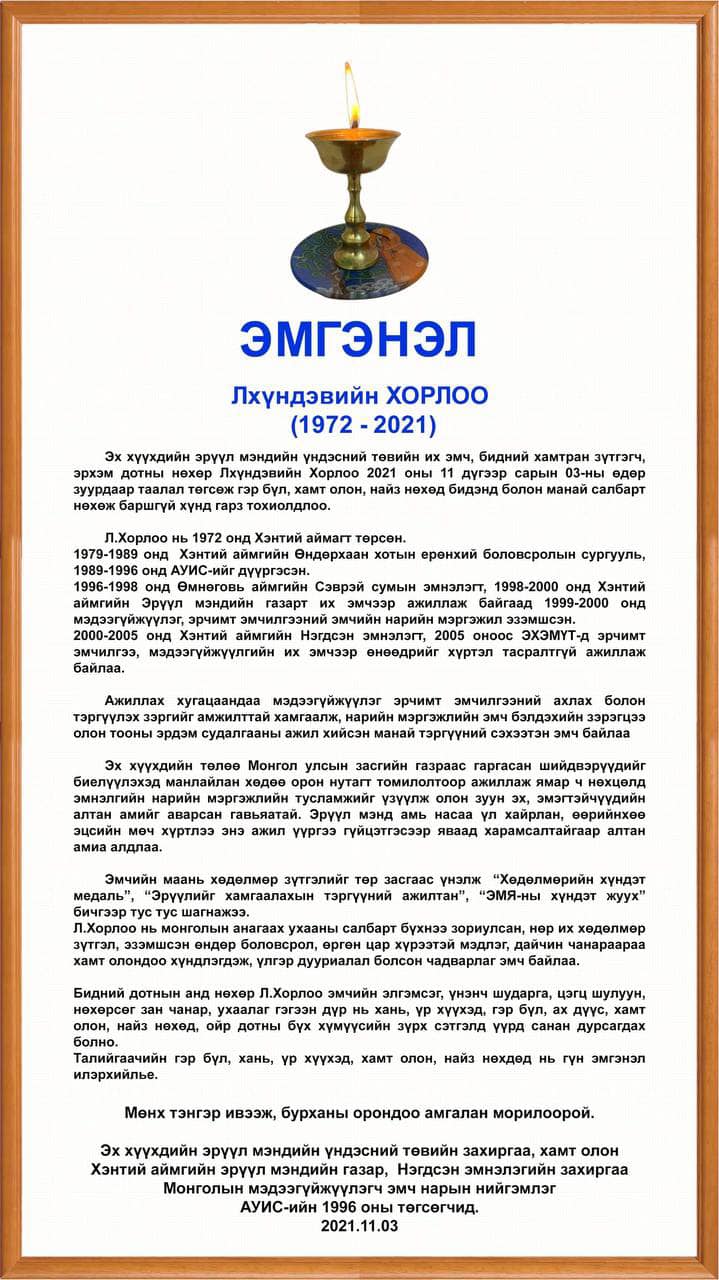 | ЭХЭМҮТ-д нас барсан Л.ХОРЛОО эмчийн найз: Миний найз коронавирусийн халдвар туссан. Тиймээс цус нь бүлэгнэж, зүрх нь хаагдсан байх |