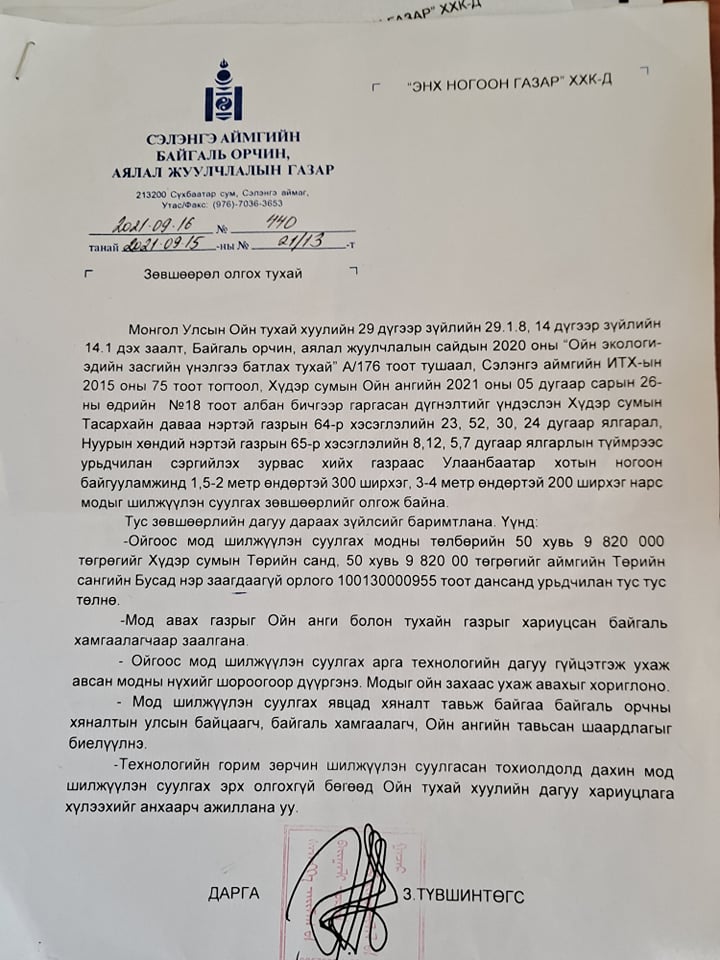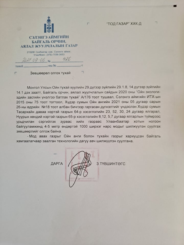 Тус зөвшөөрлийн санамж бичигт “Сийрүүлэлт хийсэн модыг Улаанбаатар хотод тарихыг дэмжиж, хамтарч ажиллана” гэх утга бүхий зүйлс бичигдсэн гэнэ. Тэдний хууль бусаар, хууль зөрчиж байгуулсан зөвшөөрлийн санамж бичиг ойн модыг сүйтгэж, байгаль орчны эсрэг ноцтой гэмт хэрэг үйлдэх шалтгаан, нөхцөл байдал үүсгэж байж болзошгүй талаар эх сурвалж онцолж байв.