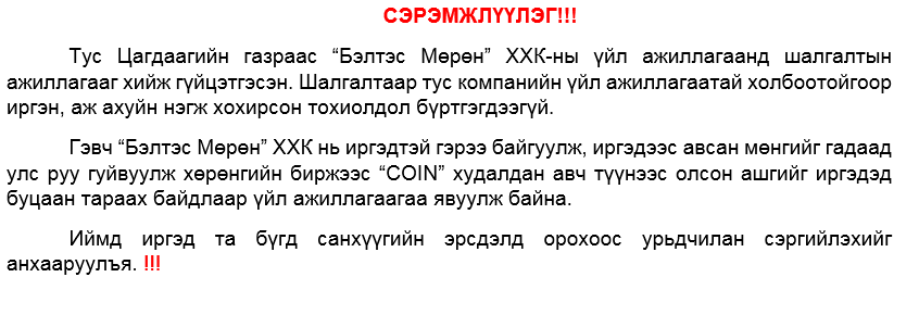 | Иргэдийн мөнгийг гадаад улс руу гуйвуулсан байж болзошгүй “Бэлтэс Мөрөн” компанийн үйл ажиллагааг зогсоожээ |
