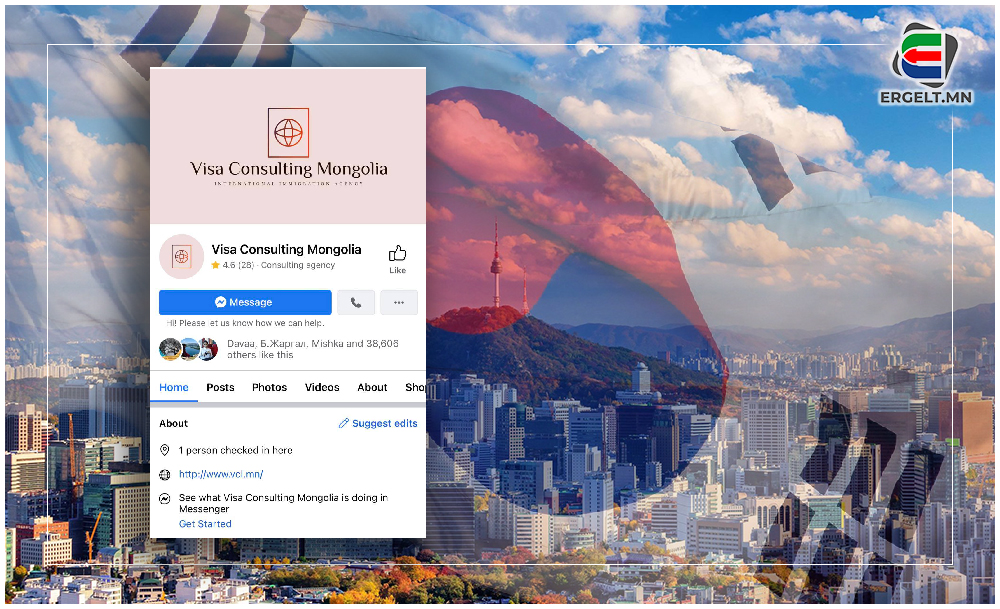 -Би эгчийнхээ хүүхдийг БНСУ руу явуулж, ажил хийлгэхээр хөөцөлдөж байгаа юм. Өнгөрсөн оны зургадугаар сард манай гэрийнхэн ийм санал гаргаад, зуучлалын компани хөөцөлдөж эхэлсэн. Тэгээд Хан-Уул дүүрэгт байрлах “VISA CONSULTING MONGOLIA” гэсэн пэйж хуудастай, зуучлалын компанид хандсан. Тус компани нь олон жил иргэдийг зуучилж байгаа гэхээр нь очиж уулзахад тэд “БНСУ руу иргэдийг явуулж өгдөг туршлагатай. БНСУ-ын Элчин сайдын яаманд танилтай. Гэрээт ажилтнаар явахад гурван төрлийн шалгалт өгдөг. Энэ гурван шалгалтад найдвартай тэнцүүлж өгөхөд найман сая төгрөг. Урьдчилгаа 1.5 сая төгрөг авна. Шалгалтын дараа гурван сая төгрөг төлнө. Үлдсэн төлбөрийг БНСУ руу явахдаа төлж болно” гэж хэлсэн. Бид урьдчилгаа төлбөр болох 1.5 сая төгрөгөө төлсөн. Гэрээт ажилтны шалгалт өнгөрсөн арваннэгдүгээр сард болсон юм. Шалгалтын үеэр бид дахин 350 мянган төгрөг төлсөн.
