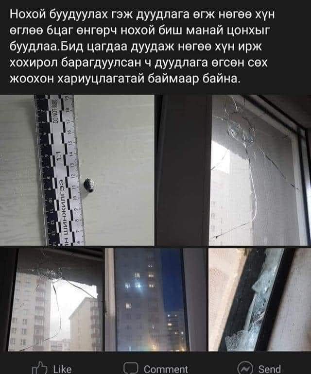 Хан-Уул дүүрэг, Яармагийн дэнж дэх “Ханбогд” хорооллын ойролцоо нохой устгалын ажил хийсэн байна. Тус хотхоны СӨХ-ны зүгээс золбин нохой их учир дуудлага өгч, буудуулахаар болжээ. Дуудлагын дагуу ажиллаж байсан тус дүүргийн ажилтнууд нохой буудах гэж байгаад сум алдаж, айлын цонх руу буудсан байна. Энэ талаар “Ханбогд” хорооллын оршин суугч хэлэхдээ “Нохой буудахаар ирсэн хүн 06:00 цагийн орчимд нохойгоо биш, манай цонхыг буудаад явлаа. Цагдаад хандаж, манай цонх руу буудсан хүн ирж хохирол барагдуулсан. Гэсэн ч дуудлага өгсөн СӨХ хариуцлагатай баймаар байна” гэжээ.
