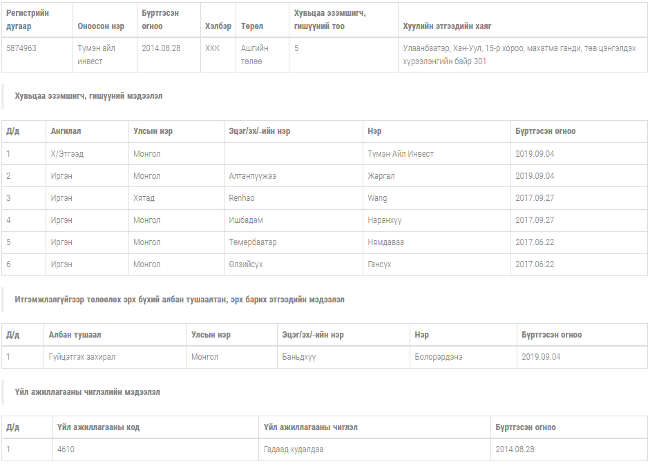 Малчдыг зодож, танхайрсан ажилтнуудтай “Түмэн айл инвест” компанийг танилцуулж байна. Тус компани нь 2014 оны наймдугаар сарын 28-нд Гадаад худалдааны чиглэлээр үйл ажиллагаа явуулахаар Улсын бүртгэлд 5874963 регистрийн дугаараар Улаанбаатар, Хан-Уул, 15-р хороо, махатма ганди, төв цэнгэлдэх хүрээлэнгийн байр 301 тоот хаяг дээр таван хүний эзэмшигчтэйгээр бүртгэгджээ. Тус компанийн хувьцаа эзэмшигчид 2017 оноос солигдож эхэлжээ. Тодруулбал, 2017 оны зургадугаар сарын 22-нд Өлзийсүхийн Гансүх, Төмөрбаатарын Нямдаваа нар хувьцаа эзэмшигчээр бүртгүүлсэн байна. Мөн төд удалгүй буюу гурван сарын дараа есдүгээр сарын 27-нд Ишбадамын Наранхүү, Renhoa Wang гэх хятад иргэн хувьцаа эзэмшигчээр нь нэмж бүртгүүлжээ. Харин 2019 оны есдүгээр сарын 4-нд иргэн Алтанпүүжээгийн Жаргал, хуулийн этгээд Түмэн айл Инвест хувьцаа эзэмшигчээр нэмж бүртгүүлсэн байна. Одоогийн байдлаар тус компанийн гүйцэтгэх захирлаар Баньдхүүгийн Болор-Эрдэнэ гэх эрэгтэй ажилладаг аж..png)