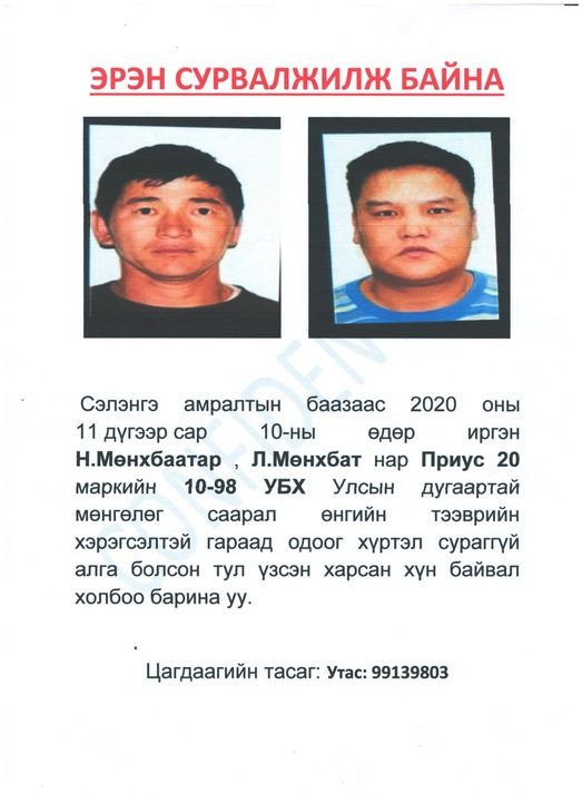 Булган аймгийн Хялганат тосгоны “Сэлэнгэ” амралтын газарт засварын ажил гүйцэтгэж байсан Улаанбаатар хотын Сонгинохайрхан дүүргийн харьяат 44 настай М, 43 настай М нар сураггүй алга болоод байсан билээ. Тэд арваннэгдүгээр сарын 10-ны 15:00 цагийн үед Орхон аймгийн чиглэлд “Приус-20” маркийн автомашинтай яваад ор сураггүй болсон юм. Онцгой байдлын алба хаагчид, ар гэрийнхэн нь сураггүй алга болсон иргэдийг 15 хоног эрэн хайж, өчигдөр Сэлэнгэ голоос олжээ. Тодруулбал, Хялганат тосгоны төвөөс хоёр км зайтай орших Сэлэнгэ голын усанд автомашинтайгаа живж нас барсан байсныг өчигдөр 17:40 цагт олжээ. Одоогийн байдлаар автомашиныг уснаас татан гаргах ажиллагааг зохион байгуулж байна.