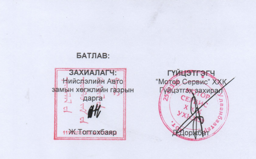 Авто зам барих тендер гурван компани үнийн саналаа явуулснаас "Мотор Сервис" ХХК шалгарч, 6,353,399881 төгрөгийн төсөвтэйгөөр төсөвтэй авто зам барих ажлаа эхлүүлсэн байна. Тухайн үедгэрээнд захиалагч тал буюу Нийслэлийн Авто замын хөгжлийн газрыг төлөөлж, Нийслэлийн Авто замын хөгжлийн газрын даргаар ажиллаж байсан(Одоо Зам, тээврийн хөгжлийн яамны Авто замын бодлогын хэрэгжилтийг зохицуулах газрын даргаар ажиллаж байгаа) Ж.Тогтохбаяр, гүйцэтгэгч буюу "Мотор Сервис" ХХК-ийг төлөөлж, тус компанийн гүйцэтгэх захирал Д.Доржбат нар гарын үсэг зурж, баталгаажуулжээ.