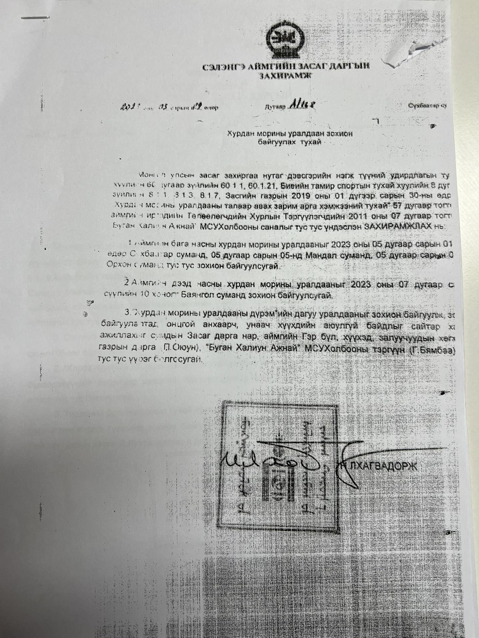 Эх сурвалжийн бидэнд өгсөн мэдээллээр “Сэлэнгэ аймгийн Мандал сумын Засаг дарга А.Дашзэвэг нь хууль бусаар “Хараагийн хурд-2023” наадмыг хууль бусаар зохион байгуулсан. Угтаа уг наадмыг Сэлэнгэ аймгийн “Буган халиун” уяачдын холбоо болон Мандал сумын “Мандал хүлэг” морин спорт уяачдын холбоо зохион байгуулах ёстой байсан. Гэтэл Засаг дарга А.Дашзэвэг нь өөрийн санаачилгаараа наадам зохион байгуулсан нь ашиг хонжоо харсан үйлдэл. Тэгээд тус наадмын санхүүжилтийг Мандал суманд хуулийн дагуу болон хууль бусаар алт олборлож, ашигт малтмал ухдаг компани, хувь хүнээс авсан нь ноцтой. Үүгээр ч зогсохгүй хууль бус алт олборлогчдоос авсан мөнгөө нярав Н.Сэлэнгийн эзэмшлийн “Цогт тэмүүлэл” ХХК болон хувийн дансаар нь шилжүүлж авсан байдаг юм билээ. Энэ хэрэгт буруутгагдаад шалгагдаж байгаа ч хуулийн хариуцлага хүлээхгүй өнгөрөх бололтой. Угтаа ямар ч төрийн байгууллагын ажил хууль ёсны дагуу явах ёстой. Гэтэл сумын Засаг дарга нь энэ мэт хууль бус асуудалд оролцоод байна шүү дээ” гэв.