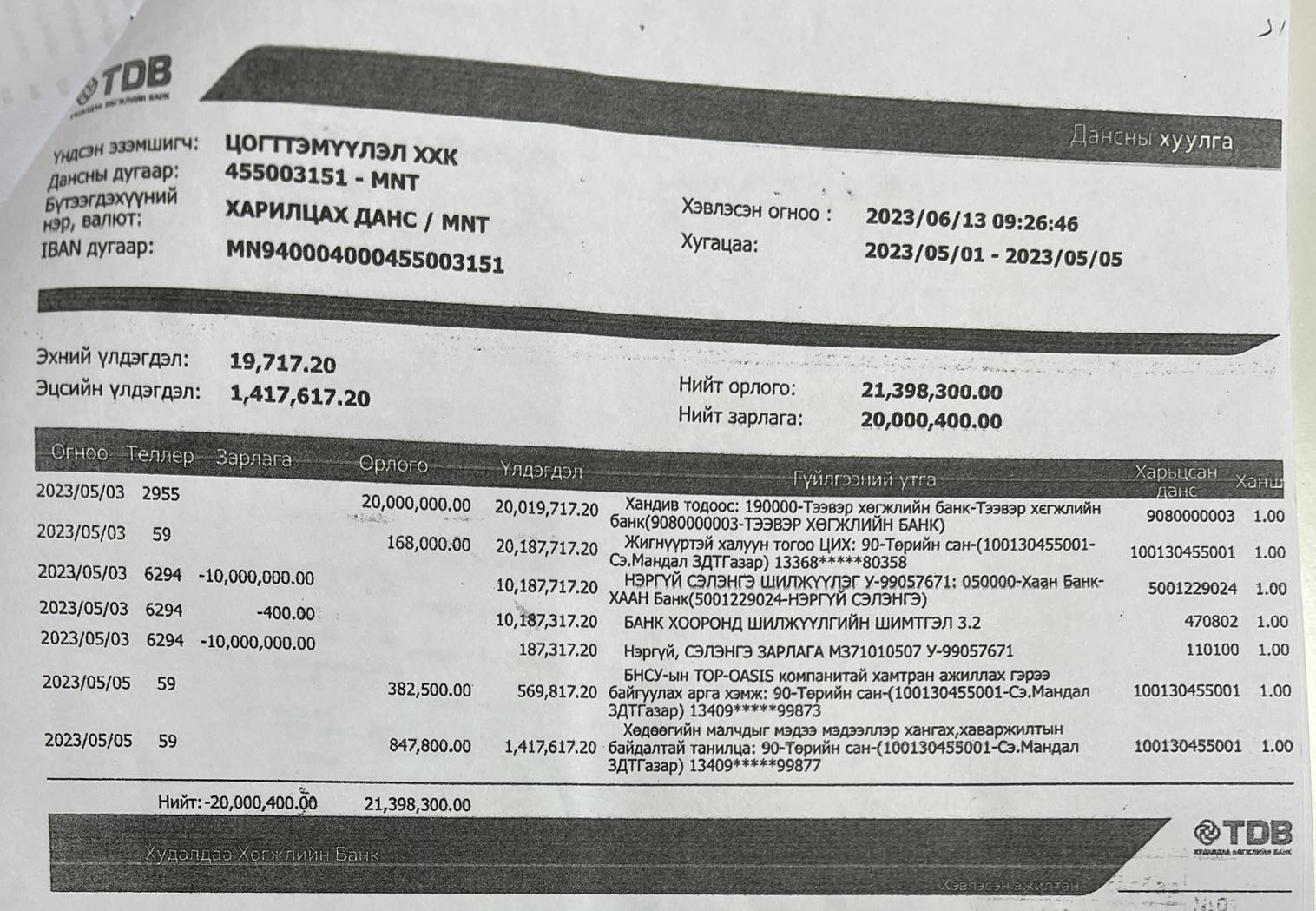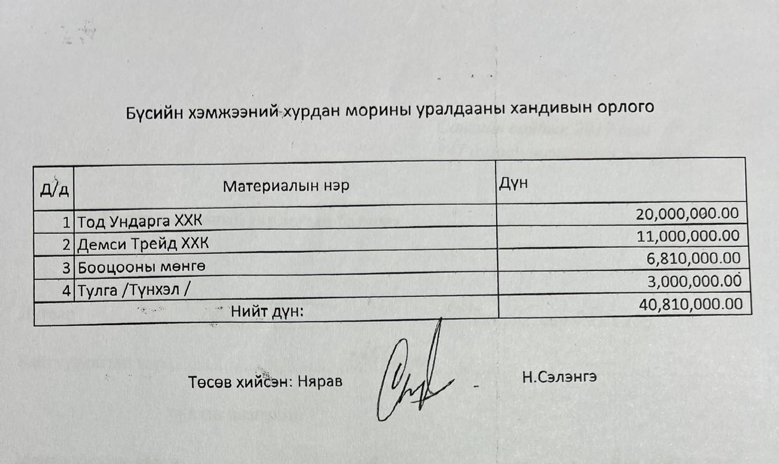 Мандал сумын Засаг дарга А.Дашзэвэг нь нярав Н.Сэлэнгээгээ мөнгө шилжүүлж авах данс олгох даалгавар өгчээ. Нярав Н.Сэлэнгийн эзэмшлийн “Цогттэмүүлэл” ХХК-ийн дансанд 2023 оны тавдугаар сарын 3-нд “Тод Ундарга” гэх компаниас хандив гэсэн утгатайгаар 20 сая төгрөг шилжиж орж иржээ. Уг гүйлгээнээс 10 сая төгрөгийг нь нярав Н.Сэлэнгэ хувийн данс руугаа шилжүүлж авчээ. Харин үлдэгдлээр нь Мандал сумын ЗДТГ-т жигнүүртэй халуун тогоо, БНСУ-ын ТOP-AOSIS компанитай хамтран ажиллах гэрээний төлбөр, хөдөөгийн малчдыг мэдээ, мэдээллээр хангах, хаваржилтын байдалтай танилцах зэргээр зарлагдаж, гүйлгээ хийжээ.