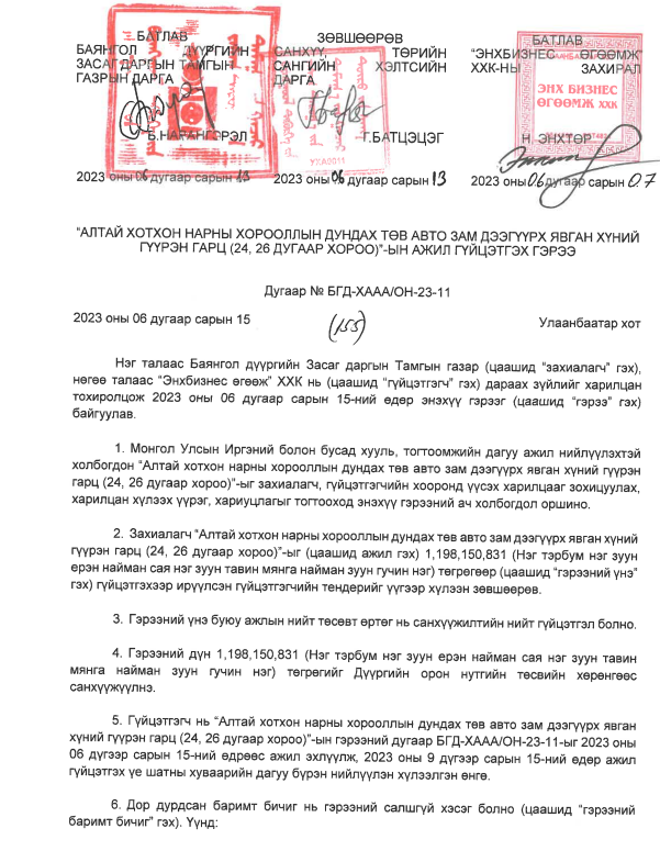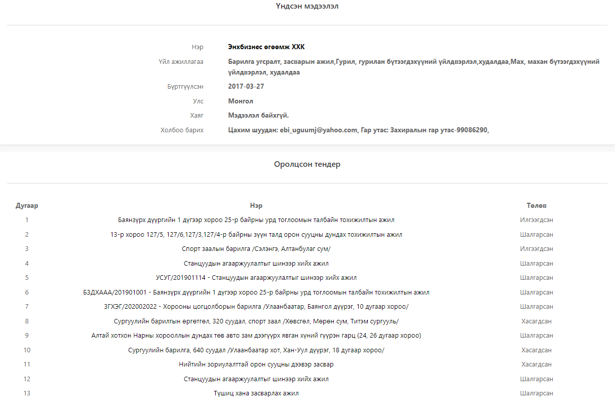 -Тийм ээ, манай компани 2017 оноос хойш үйл ажиллагаа явуулж байгаа. Барилга угсралт, засварын ажил, гурил, гурилан бүтээгдэхүүний үйлдвэрлэл,худалдаа, мах, махан бүтээгдэхүүний үйлдвэрлэл, худалдаа зэргээр үйл ажиллагаа явуулах зөвшөөрөлтэй. Бид Баянгол дүүргийн худалдан авах ажиллагааны албанаас зарласан Алтай хотхон, Нарны хорооллын дундах төв авто зам дээгүүрх явган хүний гүүрэн гарц (24, 26 дугаар хороо)-ны тендерт шаардлагатай бичиг баритаа илгээж, шалгарсан. Төсөв нь 1.5 тэрбум төгрөг орчим байсан ч бид 1.2 тэрбум төгрөгөөр барьж гүйцэтгэхээр болсон. Гэрээний дагуу үүргээ гүйцэтгэж, хийсэн ажлаа хүлээлгэж өгсөн.