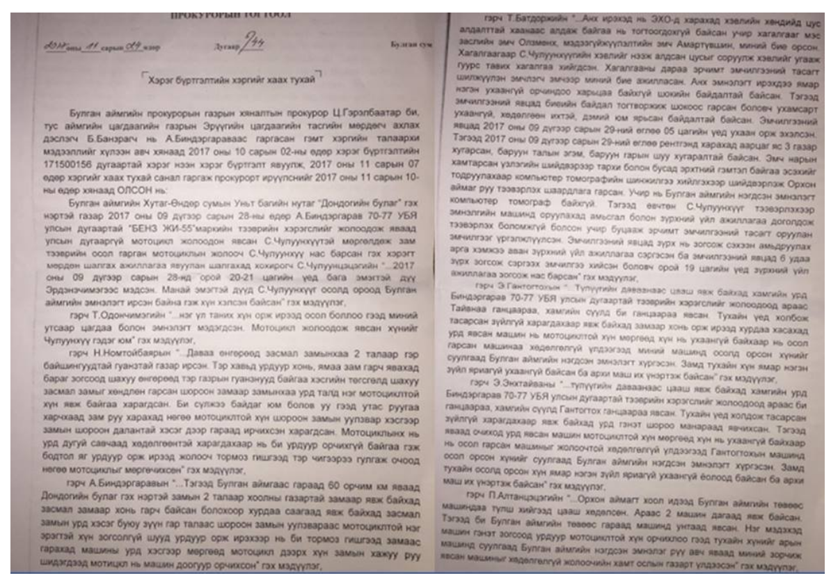 Гэрч Н.Номтойбаяр “Даваа өнгөрөөд засмал замынхаа хоёр талаар гэр гуанзтай газар явж байсан. Тэр хавьд явж байхад машин зам дээгүүр хонь, ямаа гарч таарсан. Хурдаа хасаж, бага зэрэг зогсоод хонь, ямаануудыг өнгөрөөгөөд гэр гуанзны төгсгөл хэсэгт ирсэн. Засмал замыг хөндлөн гарсан шороон замаар мотоциклтэй хүн явж байгаа харагдсан. Би “Сүлжээ байдаг юм болов уу” гээд утсаа харчихаад дээшээ болоход өнөөх мотоциклтэй хүн шороон замын уулзвар хэсгийн далан дээр гараад ирчихсэн харагдсан. Мотоциклийнх нь урд дугуй савчаад хөдөлгөөнтэй харагдахаар нь би урдуур орчихгүй гэж бодоод явж байтал яг урдуур ороод ирсэн. Манай жолооч машинаа зогсоох гэж хичээсэн ч гулгаж очоод мотоциклтэй хүнийг мөргөчихсөн” гэх мэдүүлэг.