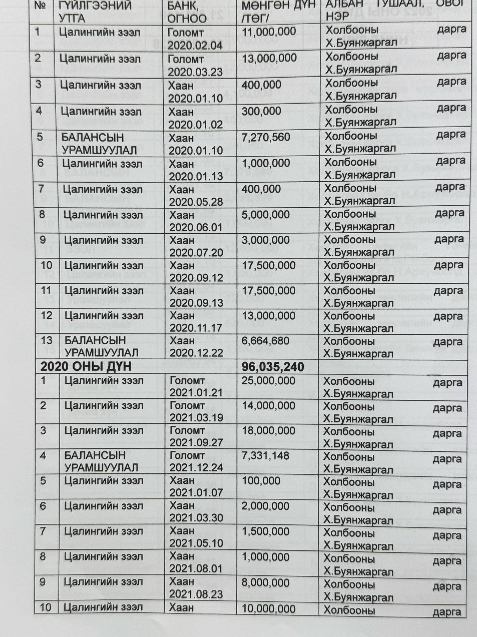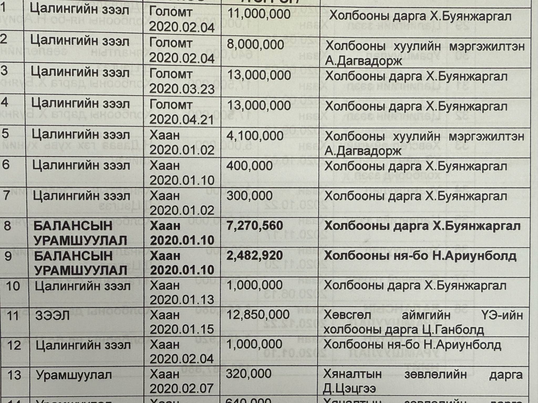 Мөн цалингийн зээлээс гадна Х.Буянжаргал, Д.Долгор, О.Баярхүү, Н.Ариунболд, А.Дагвадорж нар Монголын Эрчим хүч, Геологи, уул уурхайн ҮЭ-ийн холбооны данснаас санхүүгиййн баримтгүй олон удаагийн гүйлгээ хийжээ.