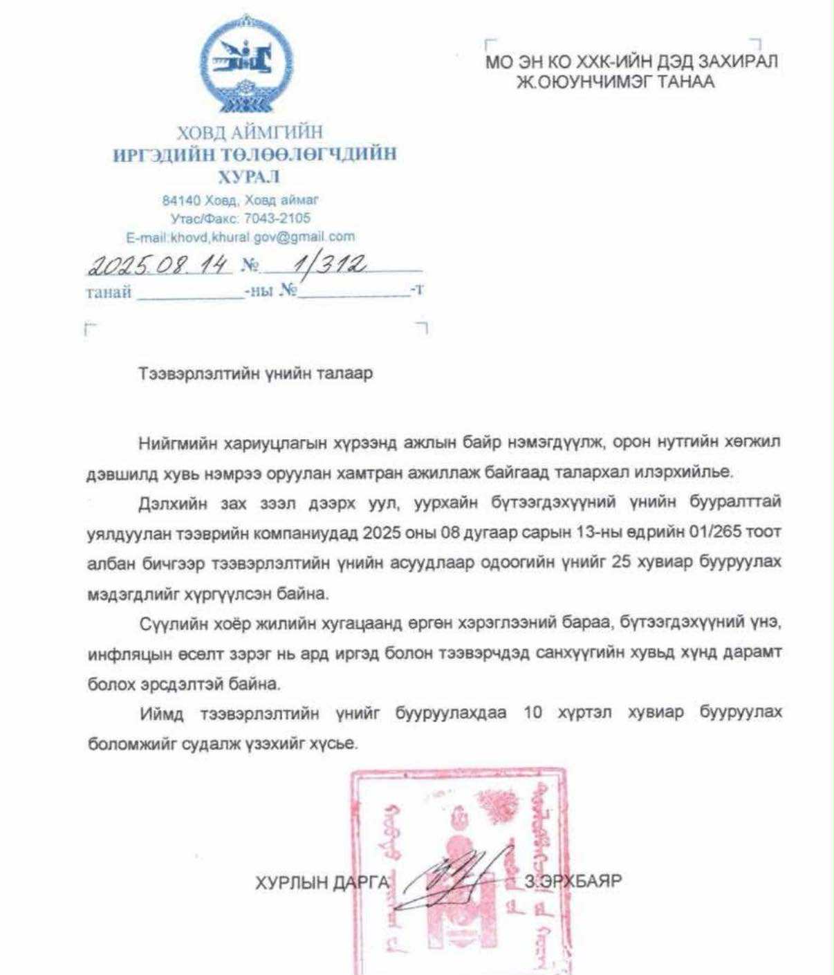 Харин Ховд аймгийн ИТХ-ын дарга З.Эрхбаяр Ж.Оюунчимэг рүү албан бичиг явуулжээ. Ингэхдээ “Нийгмийн хариуцлагын хүрээнд ажлын байр нэмэгдүүлж, орон нутгийн хөгжил дэвшилд хувь нэмрээ оруулж байгаад талархал илэрхийлье. Дэлхийн зэх зээл дээрх уул, уурхайн бүтээгдэхүүний үнийн бууралттай уялдуулан тээврийн компаниудад 2025 оны наймдугаар сарын 13-ны өдрийн 01/265 тоот албан бичгээр тээвэрлэлтийн үнийн асуудлаар одоогийн үнийг 25 хувиар бууруулах мэдэгдлийг хүргүүлсэн байна. Сүүлийн хоёр жилийн хугацаанд өргөн хэрэглээний бараа, бүтээгдэхүүний үнэ, инфляцын өсөлт зэрэг нь ард иргэд болон тээвэрчдэд санхүүгийн хувьд хүнд дарамт болох эрсдэлтэй байна. Иймд тээвэрлэлтийн үнийг бууруулахдаа 10 хүртэл хувиар бууруулах боломжийг судалж үзэхийг хүсье” гэсэн албан бичиг явуулжээ.