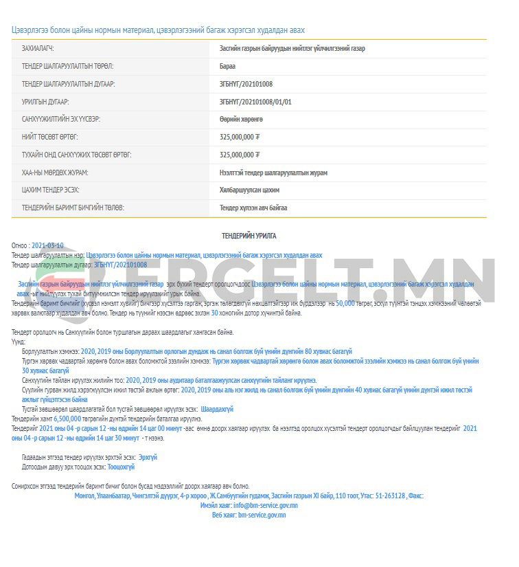 Засгийн газрын байруудын нийтлэг үйлчилгээний газраас цэвэрлэгээ болон цайны нормын материал, цэвэрлэгээний багаж хэрэгсэлийг өөрийн хөрөнгөөр худалдан авах 325 сая төгрөгийн нээлттэй тендер зарлажээ. Тендерт оролцох хугацаа нь гуравдугаар сарын 12-ноос дөрөвдүгээр сарын 12 хүртэл аж. Өөрөөр хэлбэл, цайны ханд, цэвэрлэгээний материал авахад зориулагдсан тендер нь гурван хоногийн дараа дуусах юм байна. Тендерт оролцохын тулд 50000 төгрөг төлөх бөгөөд өнгөрсөн хоёр жилийн хугацаанд санал болгож буй үнийн дүнгийн 40 хувиас багагүй үнийн дүнтэй ижил төстэй ажлыг гүйцэтгэсэн байх шаардлагатай.