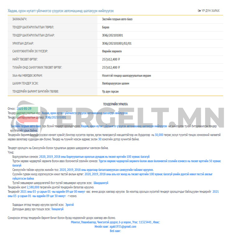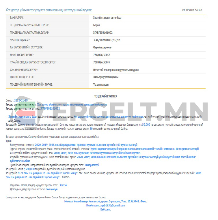 Засгийн газрын авто баазаас хөдөө, орон нутагт үйлчилгээ үзүүлэх автомашинд шатахуун нийлүүлэх 257.612.400 төгрөгийн тендерийг нэгдүгээр сарын 29-нд зарлажээ. Тендерт оролцох хугацаа нь гуравдугаар сарын 1-ний 09:30 цаг хүртэл байсан аж. Тендерийг нээлттэй зарласан бөгөөд санхүүжүүлтийн эх үүсвэр нь Засгийн газрын Хэрэг эрхлэх газар байжээ.