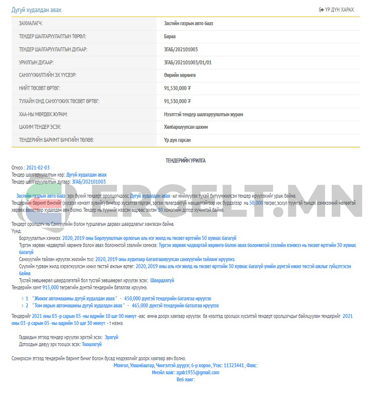 Мөн Засгийн газрын авто баазаас автомашины тос, масло худалдан авахад 25 сая төгрөг төсөвлөж, нээлттэй тендер зарласан байна. Тендерт оролцох хугацаа дөрөвдүгээр сарын 5-наар дуусгавар болжээ.