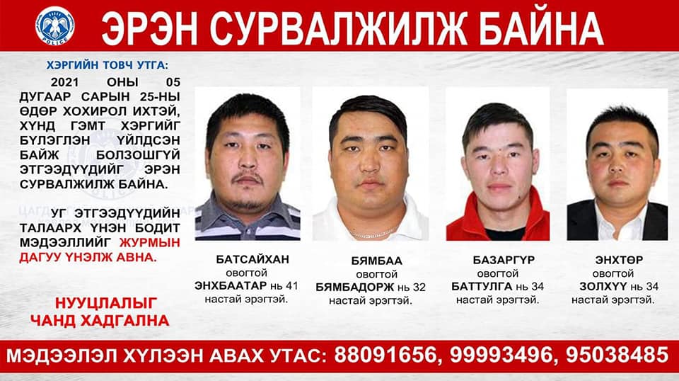 Тэдний нэг нь Хаан банкнаас 1.4 тэрбум төгрөг залилсан гэмт хэрэгт шалгагдаж байгаа Б.Бямбадорж гэгч байжээ. Мөн Б.Энхбаатар, 34 настай Б.Баттулга, Э.Золхүү гэх залуус бүлэглэн үйлдсэн байх сэжиг бүхий баримт нотолгоо олдож эхэлжээ. Б.Бямбадорж нь 2019 онд Хаан банкнаас итгэмжлэх ашиглан, БНХАУ-ын иргэний данснаас 1.3 тэрбум төгрөг залилсан. Өнгөрсөн жил “Баян айраг эксплорэйшн” ХХК-ийн бичиг баримтыг хуурамчаар үйлдэж 100 орчим сая төгрөгийг мөн л банкнаас залилж, саатуулагдаад байсан юм. Шүүхээс түүнийг батлан даалтад гаргасан байсан бөгөөд тэрбээр залилангийн хэргээр шалгагдаж байхдаа дахин гэмт хэрэг үйлджээ.