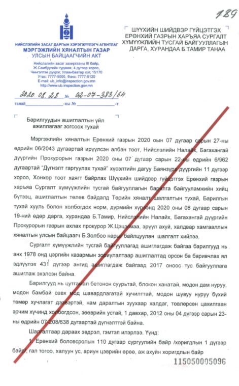 Ингээд Нийслэлийн мэргэжлийн хяналтын газар, Налайх, Багахангай дүүргийн прокурорын газраас хүүхдийн хорихын барилгууд нь газар хөдлөлийн чичирхийлэл, эсвэл хүчтэй доргиоход бүхэлдээ нурж, хоригдогч хүүхдүүдийн амь нас, эрүүл мэндэд ноцтой хохирол учруулахаар байгаа тул 2020 оны наймдугаар сарын 28-ны өдөр 02-07-383/64 дугаартай актаар бүрэн акталж, үйл ажиллагаа явуулахыг нь хориглох шийдвэр гаргажээ. Өөрөөр хэлбэл, “2012 онд актлагдсан барилгуудыг найман жил урсгал засвараар торгоож, үйл ажиллагаа явуулсан байна. Цаашид үйл ажиллагаа явуулах ямар ч боломж байхгүй, нэн яаралтай чөлөөл” гэсэн агуулгаар акталсан байгаа юм.