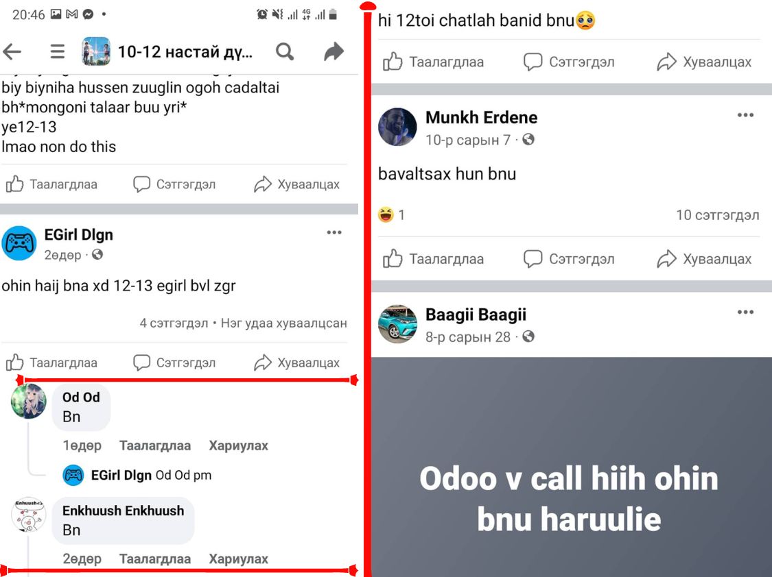 Бид энэ төрлийн гэмт хэрэгтэй манай улс хэрхэн тэмцдэг, гэмт этгээдэд хуулийн ямар хариуцлага ногдуулдаг талаар холбогдох мэргэжилтнүүдээс тодруулсан юм. НЦГ-ын мөрдөн байцаах хэлтсийн Гэр бүл, хүүхэд хүчирхийлэл, хүүхдийн эсрэг гэмт хэрэгтэй тэмцэх хэлтсийн ахлах мэргэжилтэн дэд хурандаа П.БОЛОРМАА “Өсвөр насны хүүхдүүд цахим орчинд хуурамч фэйсбүүк хаяг нээж, бусадтай танилцаж, улмаар гэмт хэргийн золиос болох тохиолдол өмнөх жилүүдийнхээс эрс нэмэгдэж байна. Энэ оны эхний арван сарын байдлаар 49 хүүхэд цахим гэмт хэргийн хохирогч болоод байна. Цахим гэмт хэрэг үйлдэгчдэд ногдуулах хуулийн хариуцлагыг чангатгах шаардлага зайлшгүй тулгарч байна” гэв.