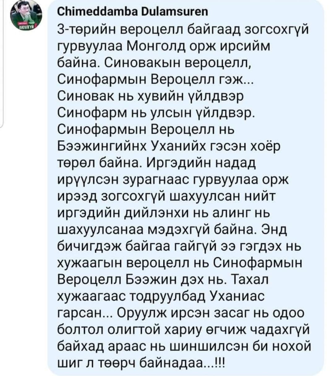 Ийнхүү иргэд коронавирусийн эсрэг вакцин хийлгээд өөрт тохиолдсон болон ойрын хүндээ илэрсэн шинж тэмдэг, учирсан таагүй явдлаа ийнхүү бичсэн байна. Энэ сарын 3-ны өдрөөс хөдөө, орон нутгийн иргэдийг вакцинжуулж эхэлсэн. Мөн орон нутгийн иргэдийн зүгээс таагүй мэдээ дуулдаж эхэллээ.