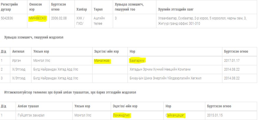 Хамгийн ноцтой нь, “Гео зил” ХХК-ийг хамтран эзэмшигч Ням-Очирын Ариунзаяа нь ШШГЕГ-ын дарга, генерал Д.Загджавын төрсөн дүү Д.Загдсүрэнгийн охин. Мөн “Минвеско” ХХК-ийн гүйцэтгэх захирал Лонжидпилын Сайханцэцэг нь Д.Загджавын үүсгэн байгуулсан “Монголын хөгжлийн үүд” сангийн Удирдах зөвлөлийн даргаар ажилладаг юм байна. Гэхдээ “Гео зил” ХХК-ийг эзэмшигч Н.Ариунзаяа нь 2019 онд их сургуулиа төгссөн, гадаадад амьдарч байгаад ирсэн, өнгөрөгч зургадугаар сард нэр бүхий гаалийн байцаагчийн хүүтэй гэрлэсэн юм байна. Ингэж харвал, хятадуудын хамааралтай, лицензийн хэрэгт холбогдоод байгаа дээрх компаниудын жинхэнэ эздийг Н.Ариунзаяа гэх эмэгтэйгээр өнгөлөн далдалж байна гэж харагдаж байгаа юм.