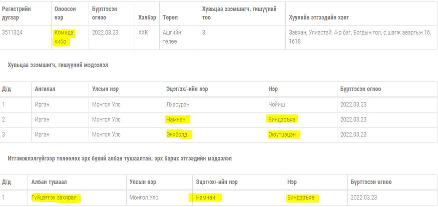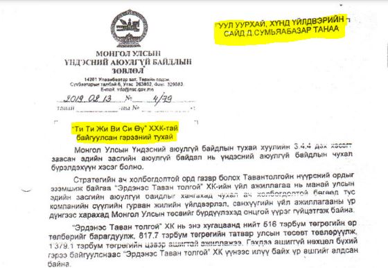 Түүнчлэн “Ти Ти Жи Ви Си Өү” ХХК-ийн Монгол талын эзэн Э.Оюутцэцэн нь Хятадуудтай хамтарч эзэмшдэг “Тахилт хайрхан транс” ХХК-аараа 2019 онд Засгийн газраас 500 сая ам.долларын концесс авсан. Тухайн үед Уул уурхай, хүнд үйлдвэрийн сайдаар мөн л Д.Сумъяабазар ажиллаж байлаа. Мөн Тавантолгойн уурхайгаас Ханги боомт хүртэлх 470 км хатуу хучилттай автозамын 27 жилийн хугацаатай эл концессын гэрээг “Тахилт хайрхан транс” ХХК-тай байгуулахад Засгийн газрыг төлөөлж тухайн үеийн Үндэсний хөгжлийн газрын Б.Баярсайхан гарын үсэг зурсан. Б.Баярсайхан, Д.Сумъяабазар нар Үндэсний хөрөнгө оруулалтын банкийг хамт эзэмшдэг, эртний бизнесийн хамтрагчид. | Б.ГАНХУЯГИЙН ҮЕД “ЭРДЭНЭС ТАВАНТОЛГОЙ” ХК-ААС 2.2 ИХ НАЯД ТӨГРӨГИЙН ТЕНДЕР, 500 САЯ АМ.ДОЛЛАРЫН КОНЦЕСС АВСАН Э.ОЮУТЦЭЦЭН ГЭЖ ХЭН БЭ |