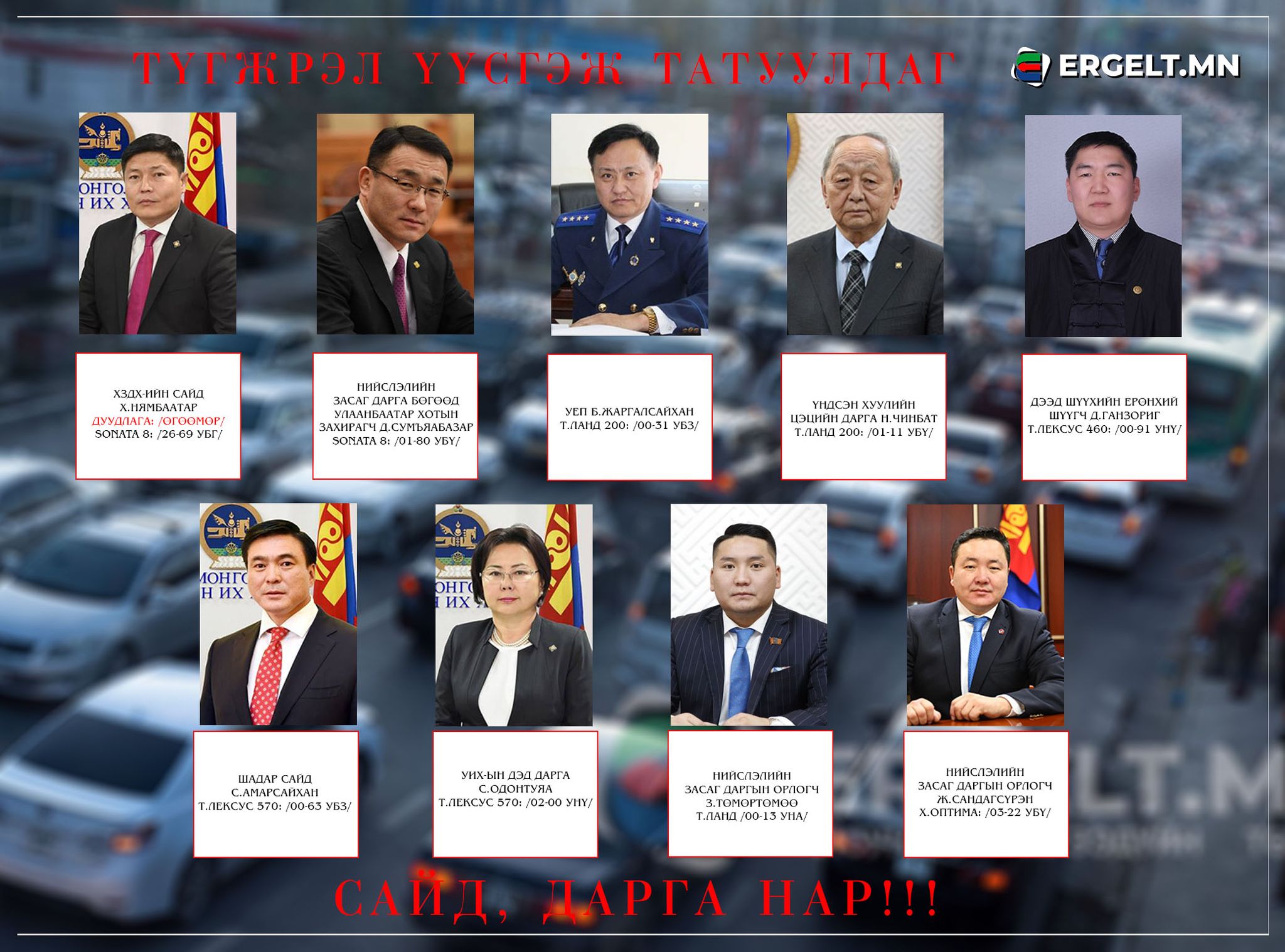 Хотын дарга нь ганцаараа түгжрэл үүсгэж, суга татуулж, өөрийнхөө явах замыг цэвэрлүүлдэггүй. Хотын хоёр орлогч нь хүртэл өөрийнхөө автомашины дугаарыг, марктай нь өгөөд, замын цагдаагийнханд тараачихсан байдаг юм байна. Тодруулбал, Нийслэлийн Засаг даргын орлогч Ж.Сандагсүрэн, орлогч З.Төмөртөмөө нарын автомашиныг явуулахын тулд зориудаар зам хааж, түгжрэл үүсгэж байж, ногоон гэрлээр ажил, гэр, цэнгээний газар, уулзалтын байрандаа хүрдэг ажээ.