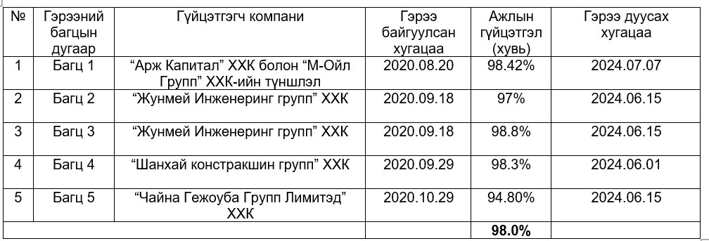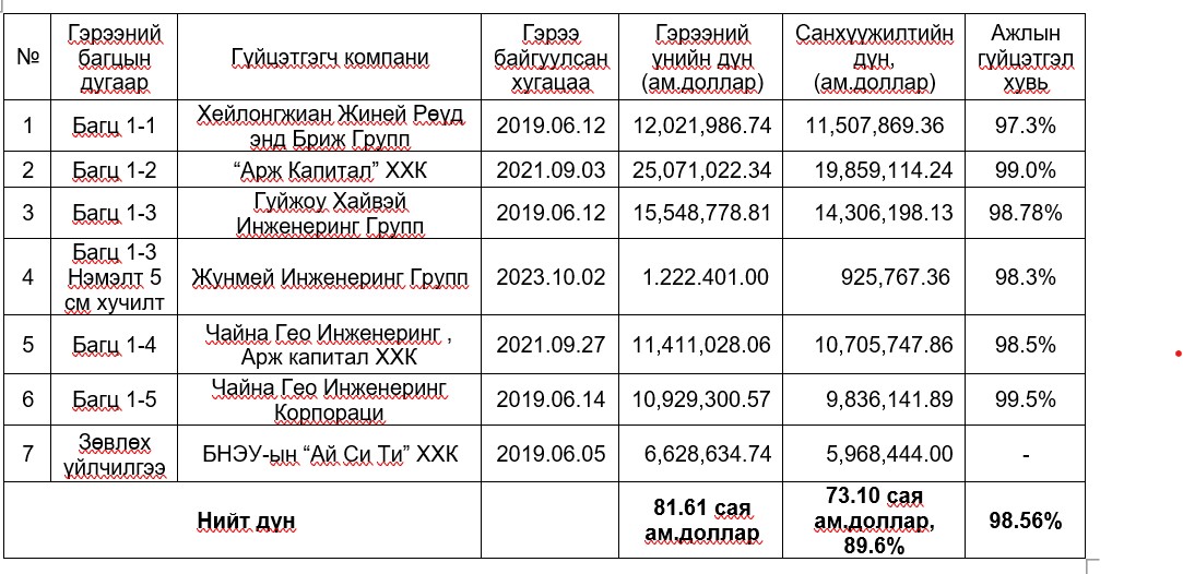 АХБ-ны “Бүс нутгийн авто зам хөгжүүлэх, засвар арчлалтын төсөл”-ийн удирдагч Б.Ууганбаяр “Манай хариуцаж байгаа таван багц замын гэрээний үнийн дүн 82 сая ам.доллар. Үүнээс өнөөдрийн байдлаар 73 сая ам.доллар буюу 90 хувийг санхүүжүүлээд байна. Таван багцаас дөрвөн багцад Улсын комисс ажиллаж, хүлээж авсан. Дөрөвдүгээр багц гүйцэтгэгч компани өөрчлөгдсөнтэй холбоотойгоор хугацаа алдсан ч арваннэгдүгээр сардаа багтаан дуусгаж, Улсын комисст хүлээлгэж өгөхөөр ажиллаж байгаа. Төслийн нийт таван багцын ажлын явц 98.56 хувийн гүйцэтгэлтэй байна. Одоогийн байдлаар зам барилгын үндсэн үе шатны ажлууд бүрэн дууссан бөгөөд талбайн цэвэрлэгээ, тоноглол, түр зам болон карьерын нөхөн сэргээлтийн ажлууд хийгдэж байгаа” хэмээлээ.
