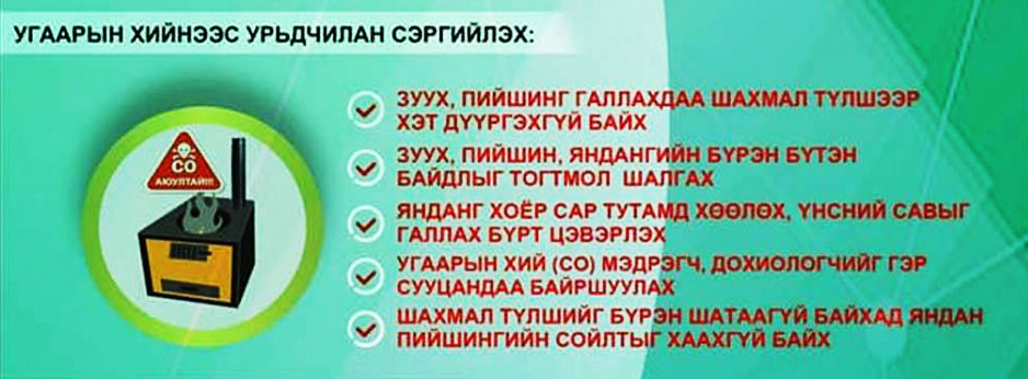 Угаар нь өнгө, үнэр, амтгүй учир нэг мэдэхэд эрхтэн тогтолцоо руу орж доголдол үүсгэж эхэлдэг. Манай байгууллага гэр хорооллын бүх айлуудаар урьдчилан сэргийлэх зөвлөмж бүхий гарын авлага тараасан. Мөн хэвлэл мэдээлийн хэрэгслээр болон цахим орчинд сэрэмжлүүлэг, заавар зөвлөгөө хүргэж ажилласаар байна.