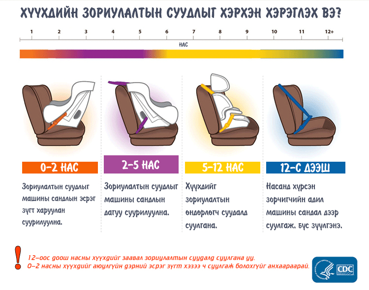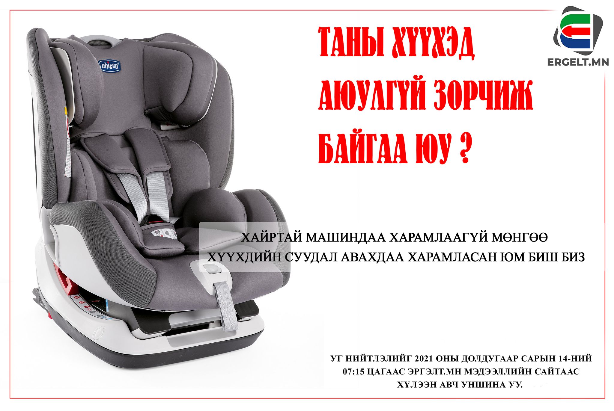 Ингээд эрхэм эцэг, эх та Монгол Улсын Замын хөдөлгөөний дүрмийн 23.8 дахь заалтад “Суудлын автомашинд болон ачааны автомашины жолоочийн бүхээгт 10 хүртэлх насны хүүхдийг тээвэрлэхдээ биеийн жин, өсөлтөд нь тохирсон зориулалтын нэмэгдэл суудал буюу хамгаалах хэрэгсэл ашиглана. Хүүхдийн нэмэгдэл суудал, хамгаалах хэрэгсэл нь MNS ISO 13216 (хүүхдийн хамгаалах систем) стандартын шаардлагад нийцсэн байх бөгөөд түүнийг тээврийн хэрэгсэлд байрлуулж ашиглахдаа үйлдвэрлэгчээс тогтоосон зааврыг баримтална” гэж заасныг мөрдөж, үр хүүхдийнхээ аюулгүй байдлыг хангаарай.