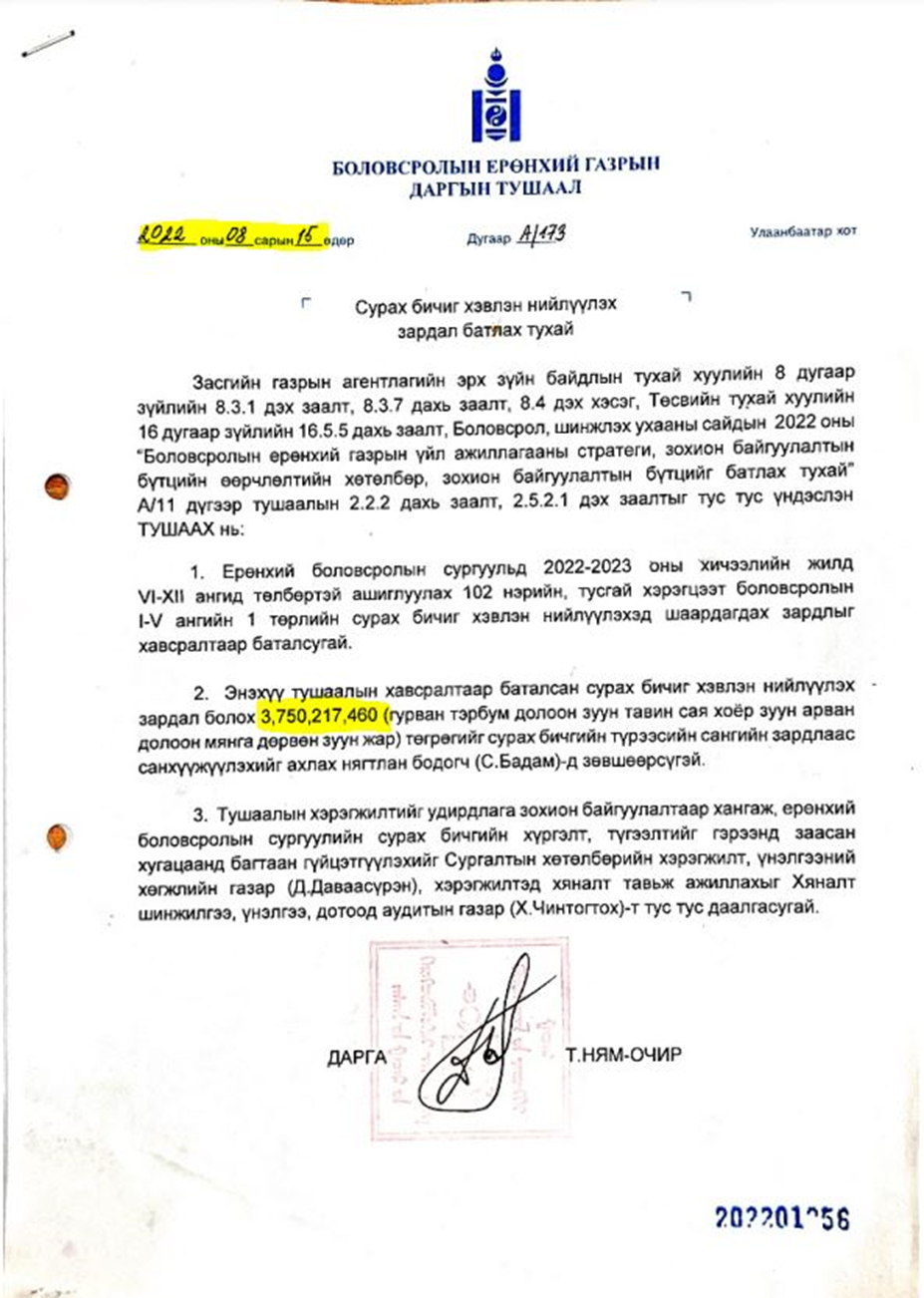 Тодруулбал, Боловсролын ерөнхий газрын дарга Т.Ням-Очирын 2022 оны наймдугаар сарын 15-ны өдрийн А/173 дугаар тушаалаар 2022-2023 оны хичээлийн жилд 3.7 тэрбум төгрөгөөр сурах бичиг хэвлэхээр болжээ. Хэвлэлийн компаниудтай гэрээ байгуулж, өнгөрөгч наймдугаар 26-нд урьдчилгаа төлбөрүүдийг нь шилжүүлсэн байна. Үүнийг Гадаад харилцааны сайд Б.Батцэцэгийн “Мөнхийн үсэг” ХХК, ЗГХЭГ-ын дарга Д.Амарбаясгалангийн “Соёмбо принтинг” ХХК нар сурах бичгийн төлбөрийг шилжүүлэн авч, гэрээ хийсэн.