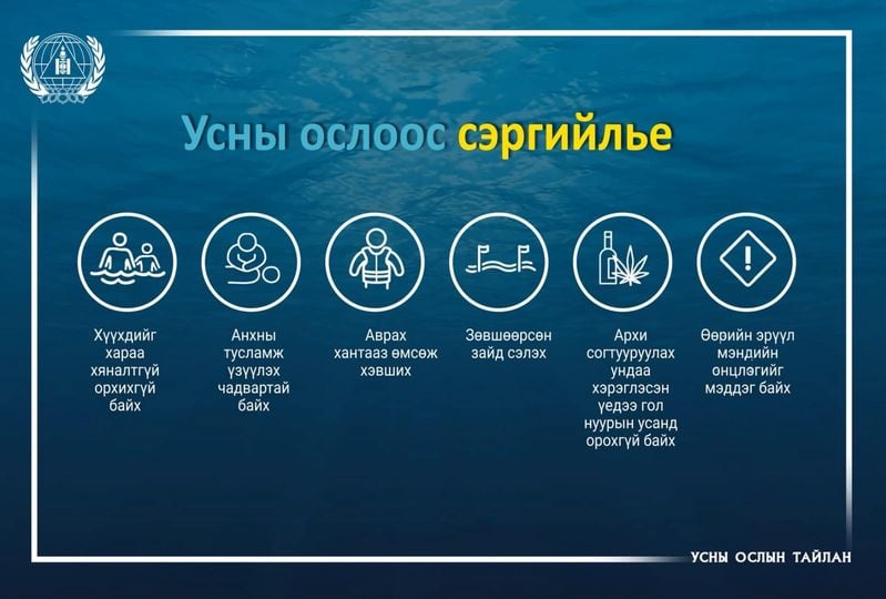 Усны осолд өртөж амиа алдсан тохиолдлын шалтгаан нөхцөлийг судлахад усанд сэлэх гэж орох, тээврийн хэрэгсэл болон ердийн хөсөг морьтой гол гатлах, хүүхдийг хараа хяналтгүй орхисноос, архи согтууруулах ундаа хэрэглэсэн үедээ усанд орсноос үүдэлтэй байгаа юм. Иймд онцгой байдлын байгууллагаас дараах зөвлөмж, сэрэмжлүүлгийг хүргэж байна.